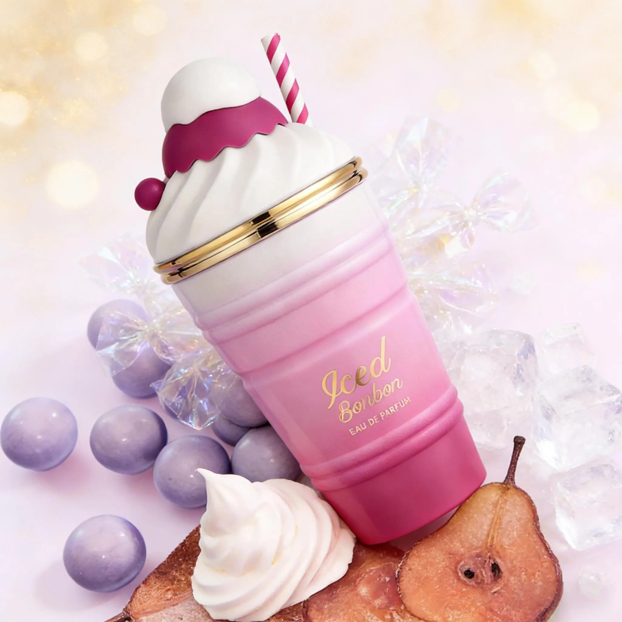 Discover the Sellion Iced Bonbon Eau De Parfum, a long-lasting floral fruity gourmand fragrance. This perfume comes in a charming pink cup design, perfect for gifting. With a volume of 3.3Oz/100ML, it offers a delightful aroma that lingers beautifully. Ideal for women who appreciate a blend of floral and fruity notes.