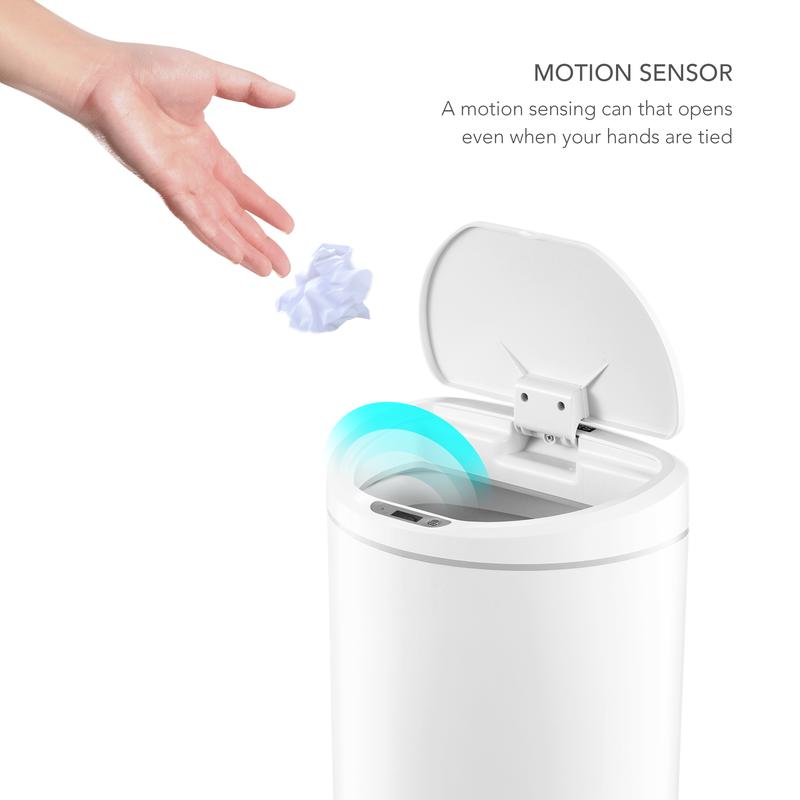 5. Ninestars 2.1 Gallon / 8 L Semi-Round Motion Sensor Trash Can, Small Automatic Touchless Trash Bin, Motion Sensor Trash Can, Waterproof, Fingerprint Proof, Durable for Bedroom, office, bathroom, White Plastic
