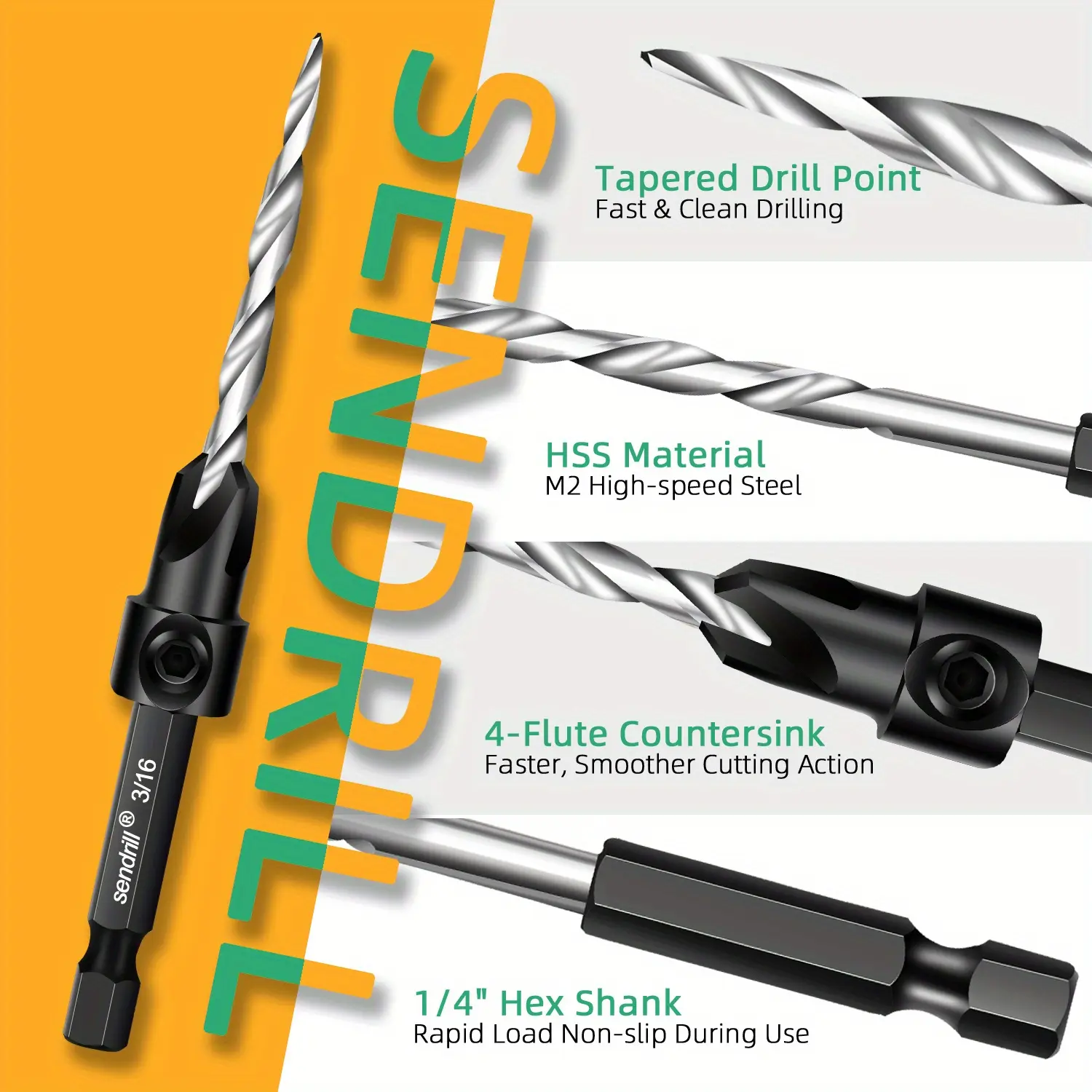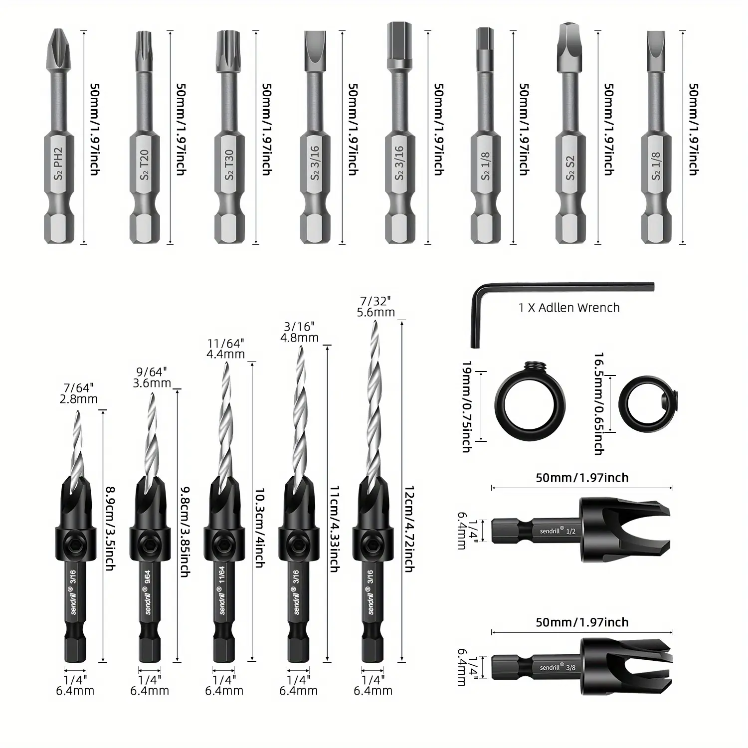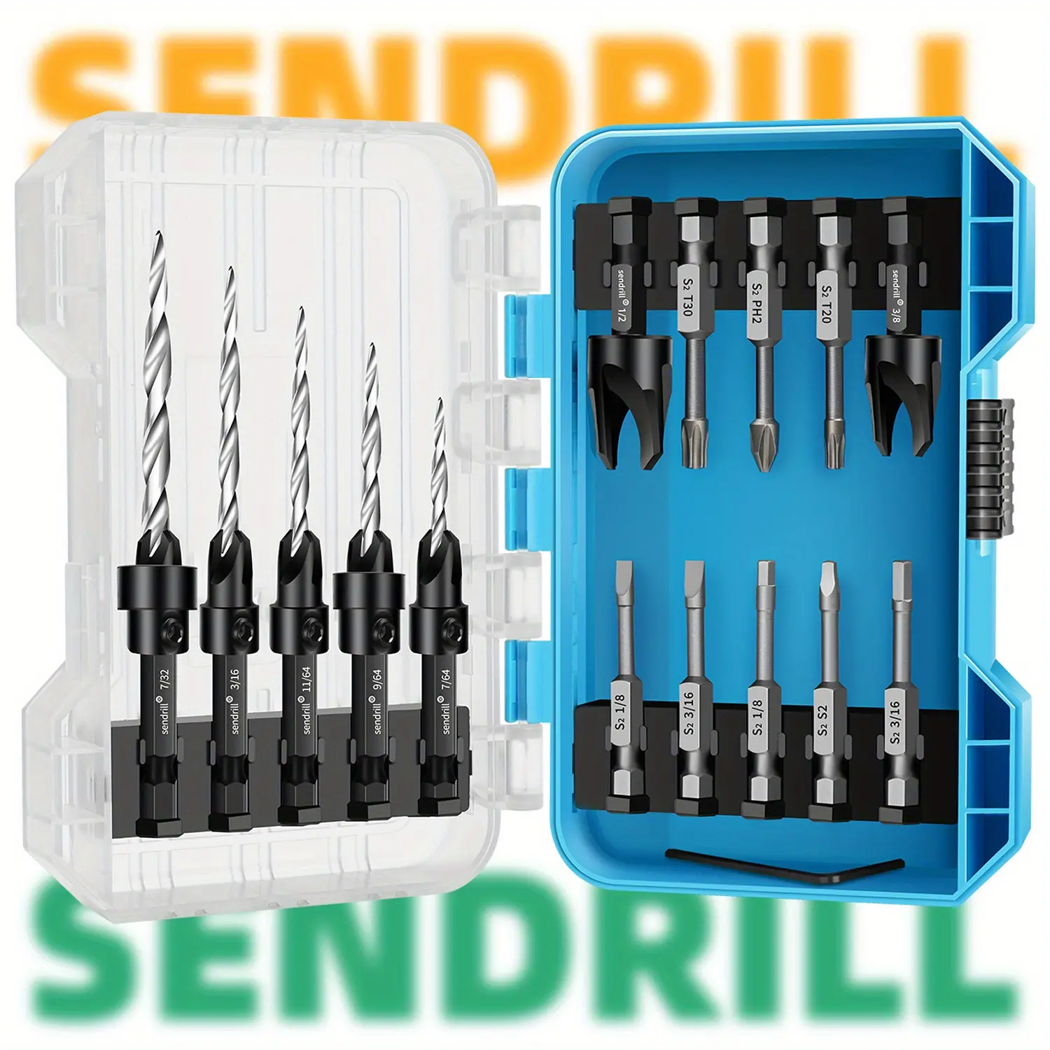 【New Upgraded Set】SENDRILL Countersink Drill Bit Set, a complete 17PCS kit designed for all your woodworking projects. This set includes 5 tapered drill bits: #4 (7/64"), #6 (9/64"), #8 (11/64"), #10 (3/16"), and #12 (7/32"). It also comes with 2 wood plug cutters (3/8" and 1/2"), 2 depth stop rings (3/8" and 1/2"), 8 screwdriver bits, and 1 Allen key. The sendrill set is crafted to ensure precision and versatility, providing all the essential tools for your woodwork.