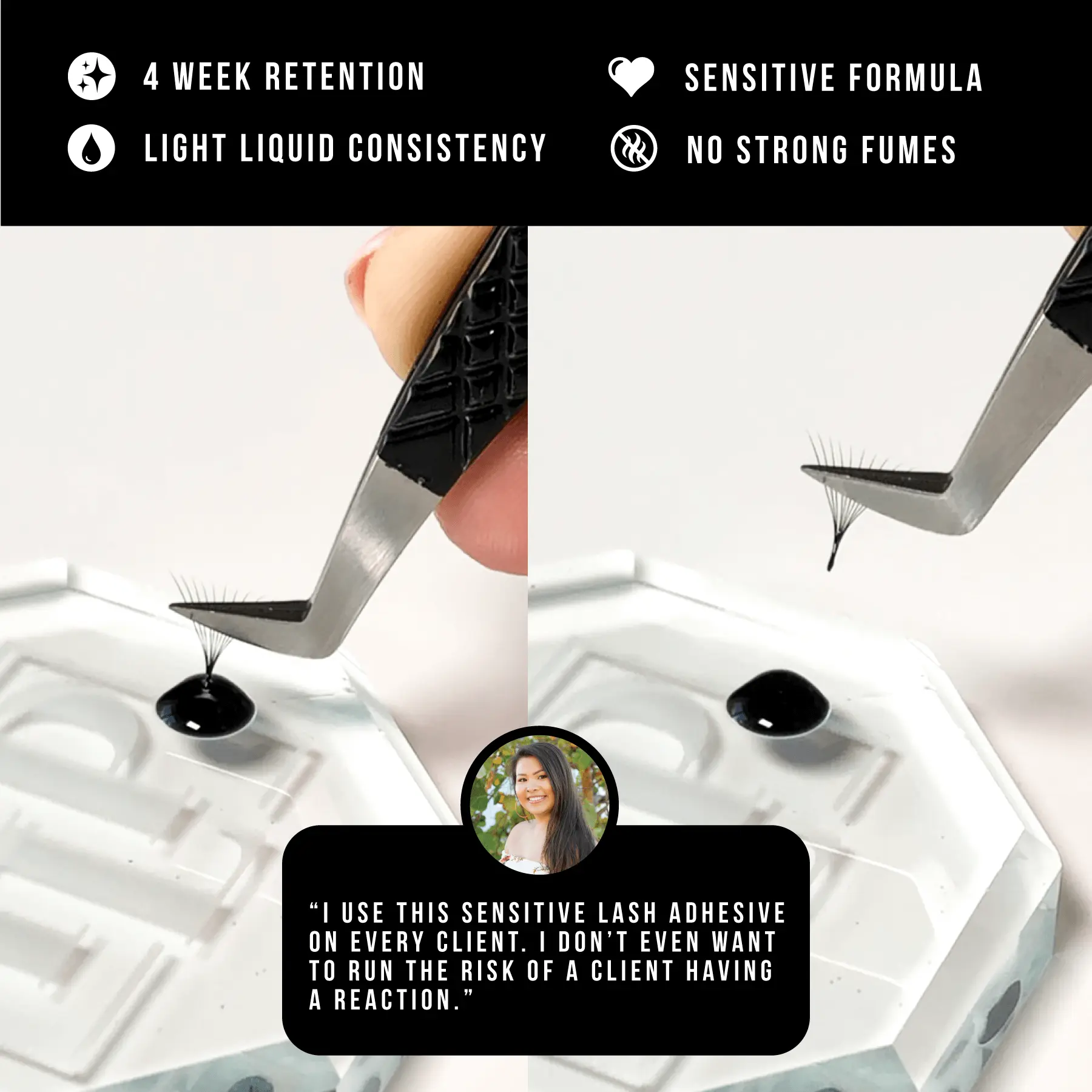 This sensitive lash glue has raised the bar! The wide humidity range makes it suitable for any location, and the gentle formula ensures a comfortable experience for clients with sensitive eyes.