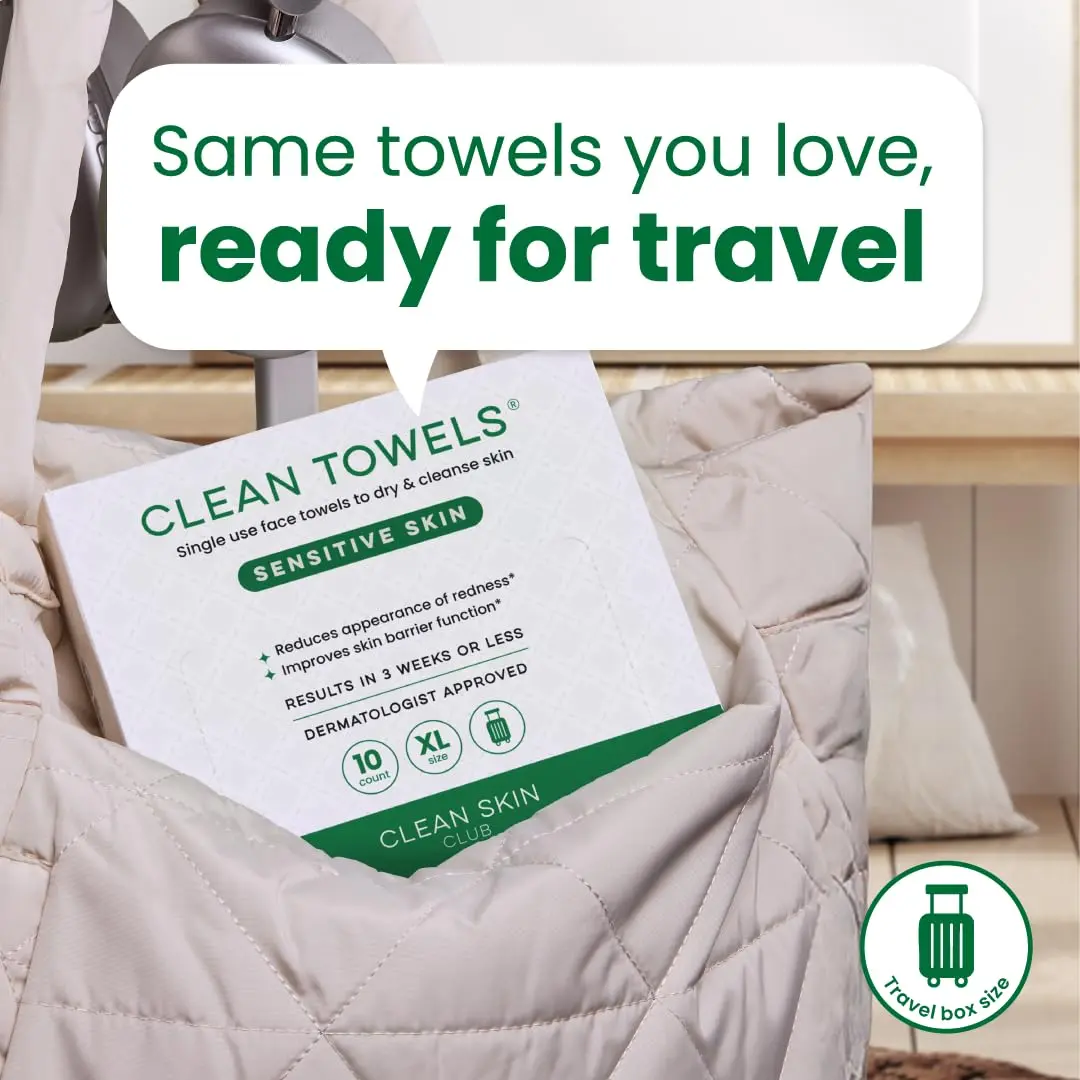 ·1 travel pack of Clean Skin Club Sensitive Skin Clean Towels XL, totaling 10 face towels. Compact and TSA-approved, ideal for on-the-go skincare, travel bags, camping, or carry-on toiletry kits. Designed for delicate, reactive, or redness-prone skin. 🌍