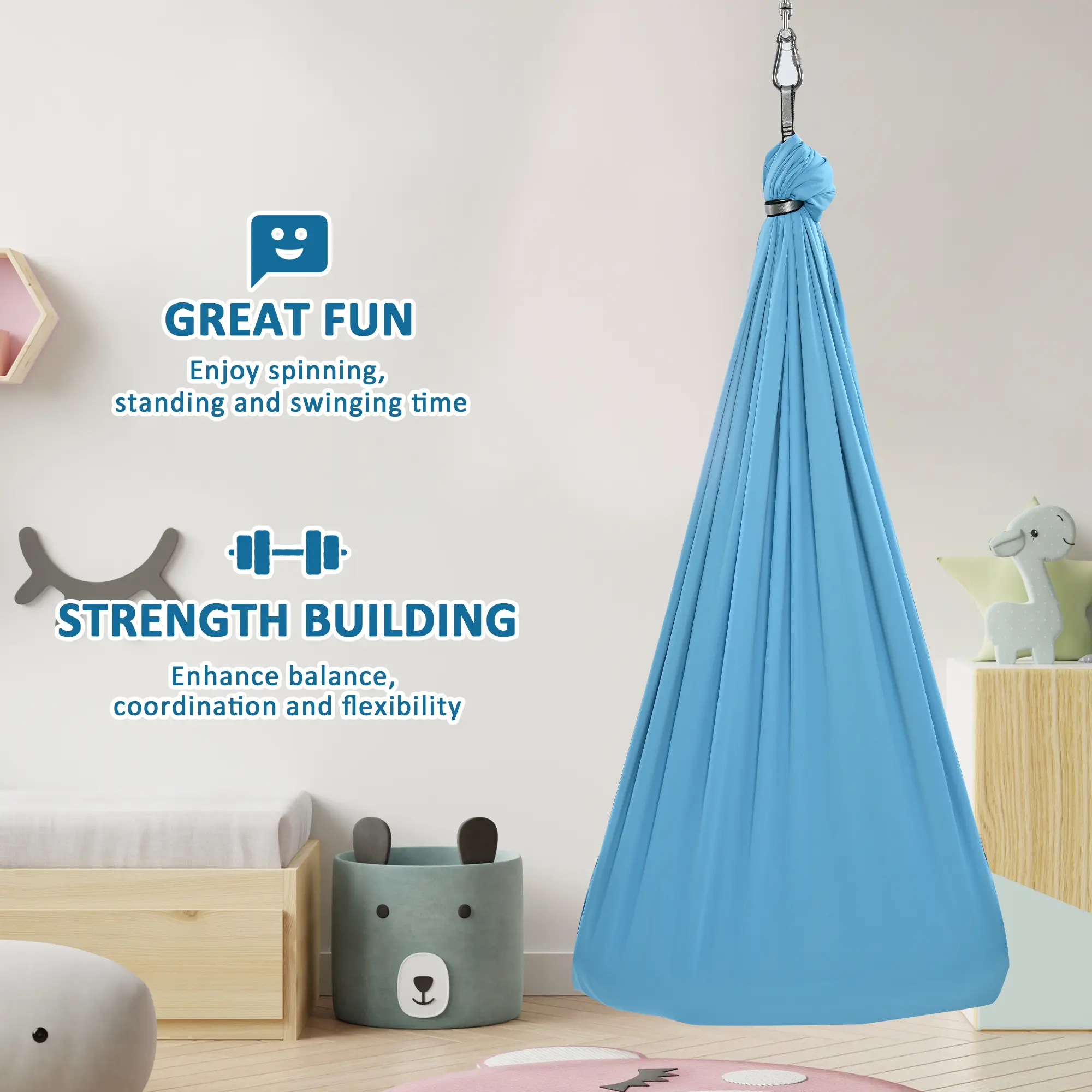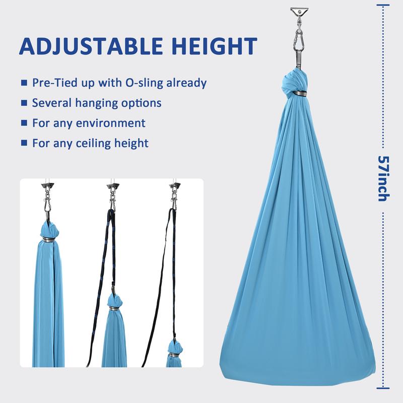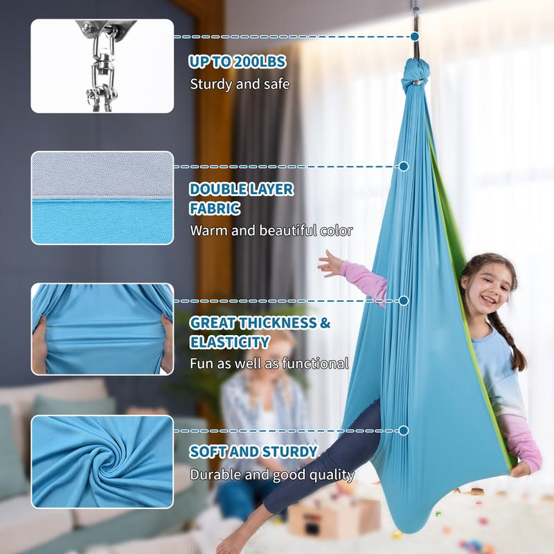 ·【DOUBLE LAYER FABRIC】-55''(H) * 59''(W). The Double layer fabric of sensory therapy swing is soft and stretchy and feels like it is cuddling you. The sensory hammock swing also enhances children's balance, coordination and flexibility.