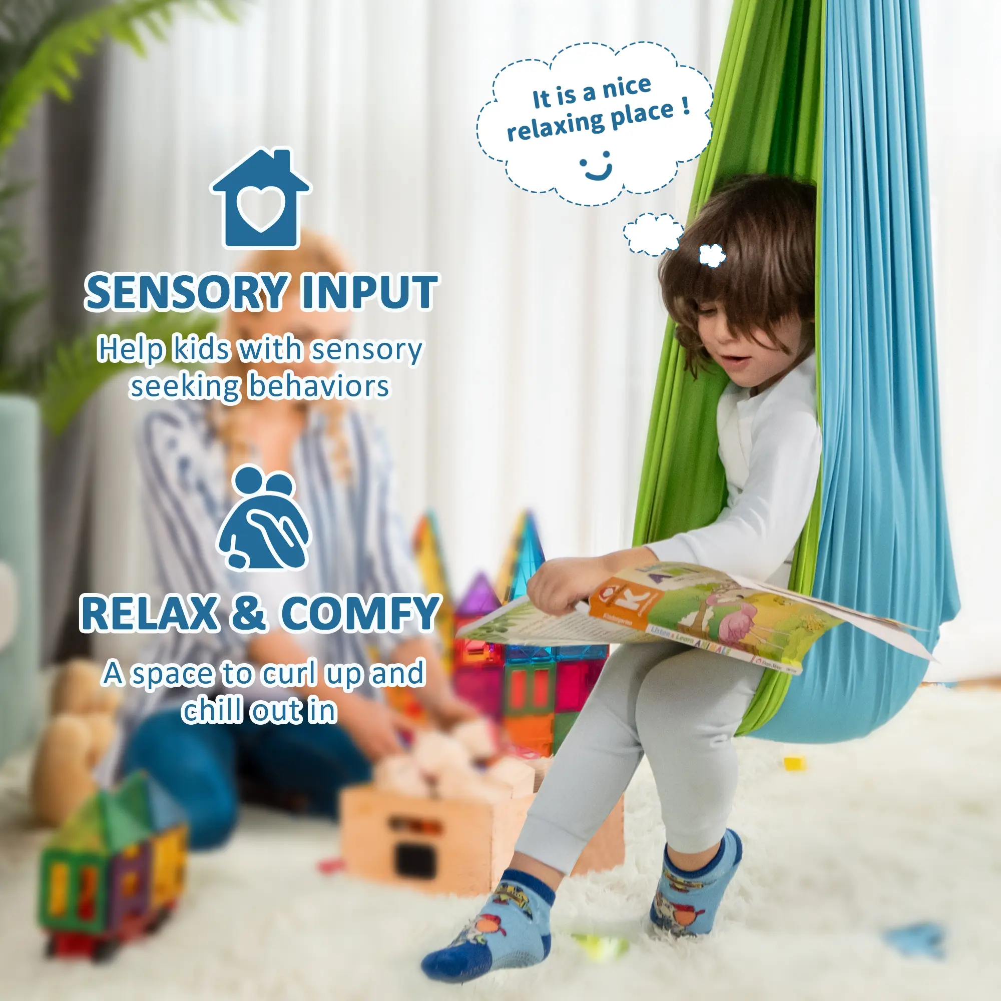 ·【EASY TO INSTALL】-Our cuddle swing for kids comes with all the hardware you need, providing several hanging options for indoor and outdoor. The sensory swing included daisy chain with the carabiner allows you to set appropriate height. Hold up to 200 lbs.