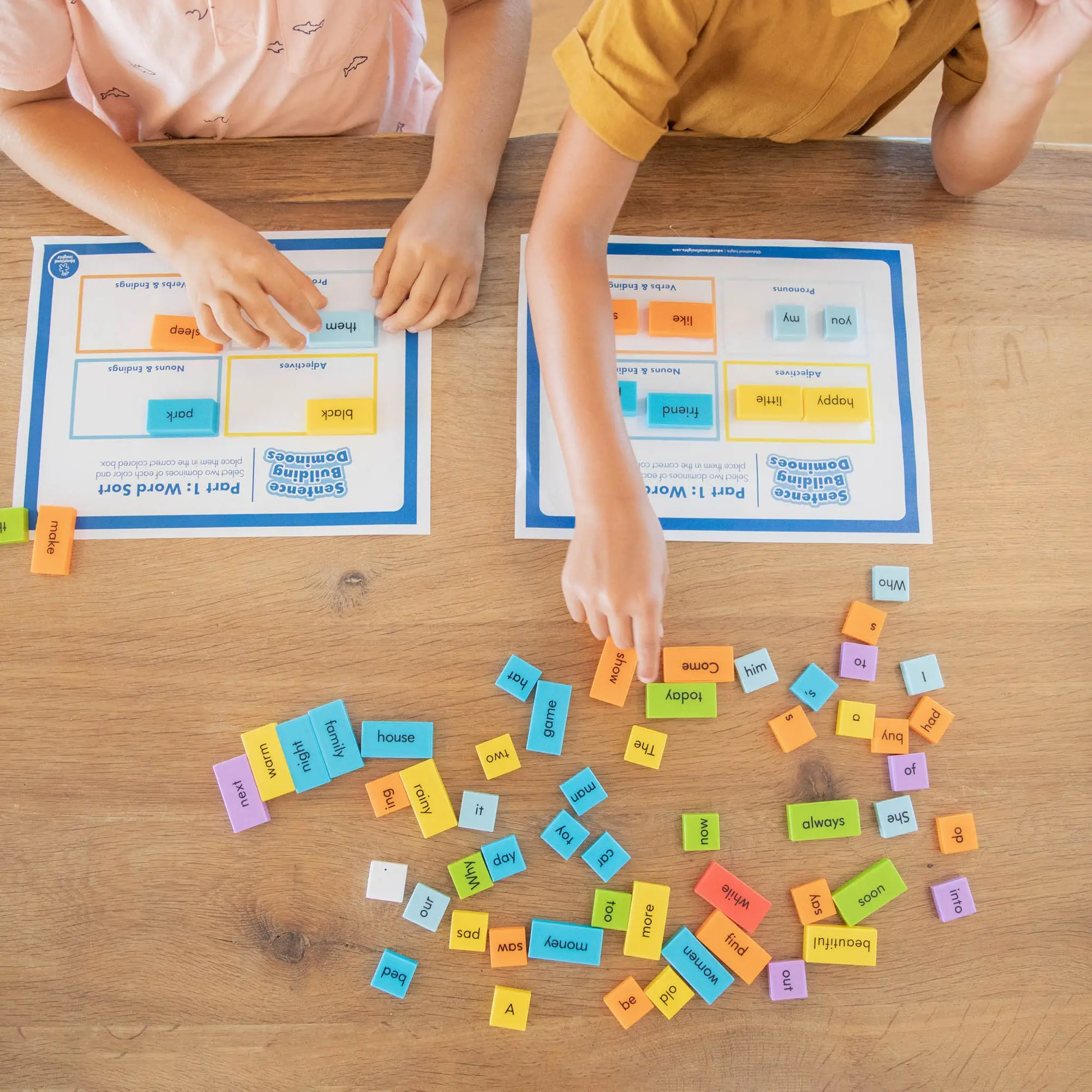 ·WHAT’S INSIDE: Set features 114 double-sided, color-coded dominoes including nouns, pronouns, verbs, adjectives, adverbs, prepositions, conjunctions, and punctuation marks, packed in a sturdy, clear storage container. Dominoes are double-sided for extra words and punctuation marks and color-coded by part of speech