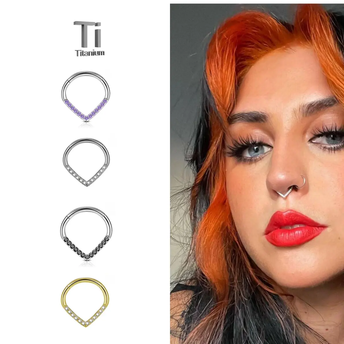 5. Oufer 16G V-shape Titanium CZ Septum Daith Piercing Ring Hoop Cubic Zirconia Grillz