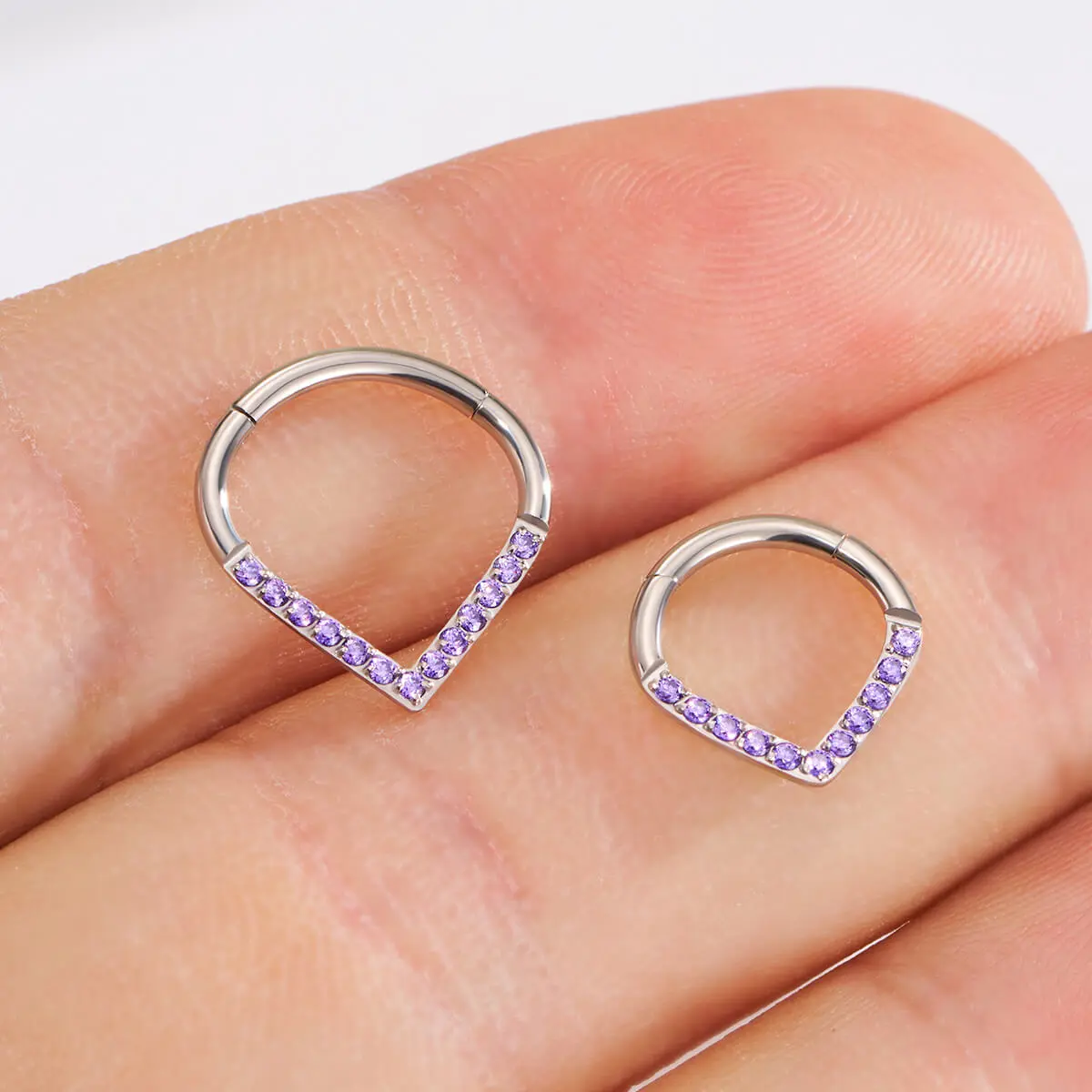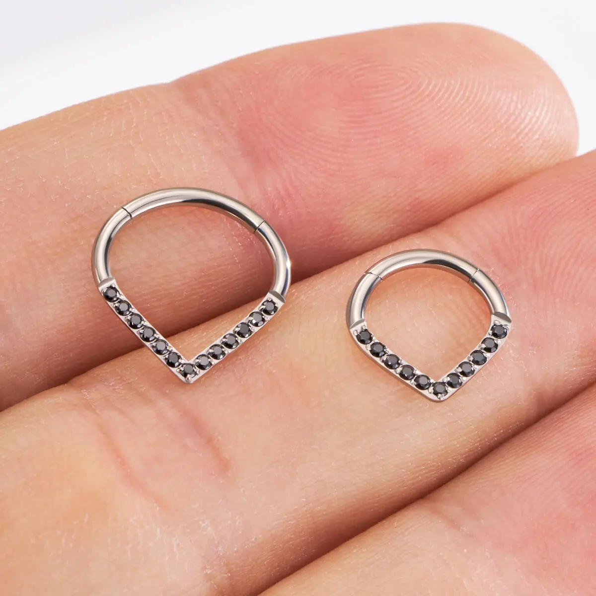 A V-shape titanium septum ring is always the best choice for those who want to make your nose look more three-dimensional. Improve the glamour of your septum piercings with the simple elegance of this 16 gauge clicker jewelry! It features a V shape at the bottom of the hoop, paved on V-shape front facings with clear cubic zirconia gems.