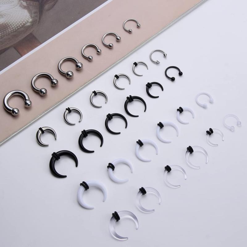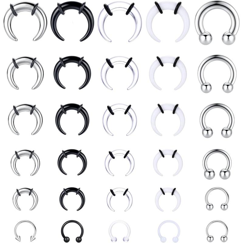 ·SEPTUM STRETCHING KIT --1 order you will get 30pcs buffalo houseshoe septum rings,5pcs White acrylic pincher tapers, 5pcs Black acrylic pincher tapers, 5pcs Clear pincher tapers,5pcs metal color acrylic pincher tapers, 10pcs stainless steel pincher tapers. Reasonable price and provide you with more matching options
