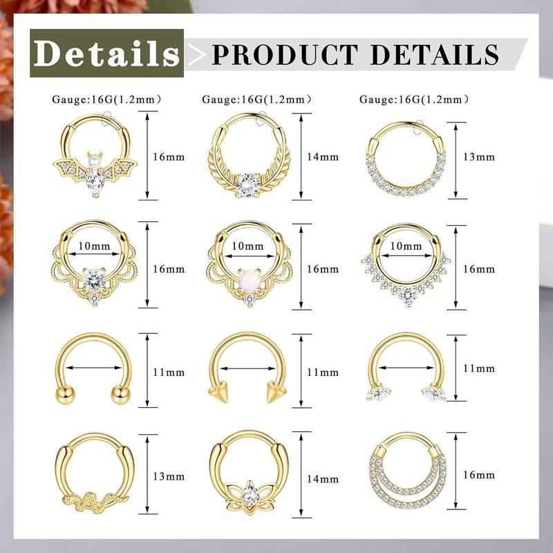 One order you will receive 12Pcs septum clicker rings in different styles: CZ,Opal, Snake, Bat, Leaf
