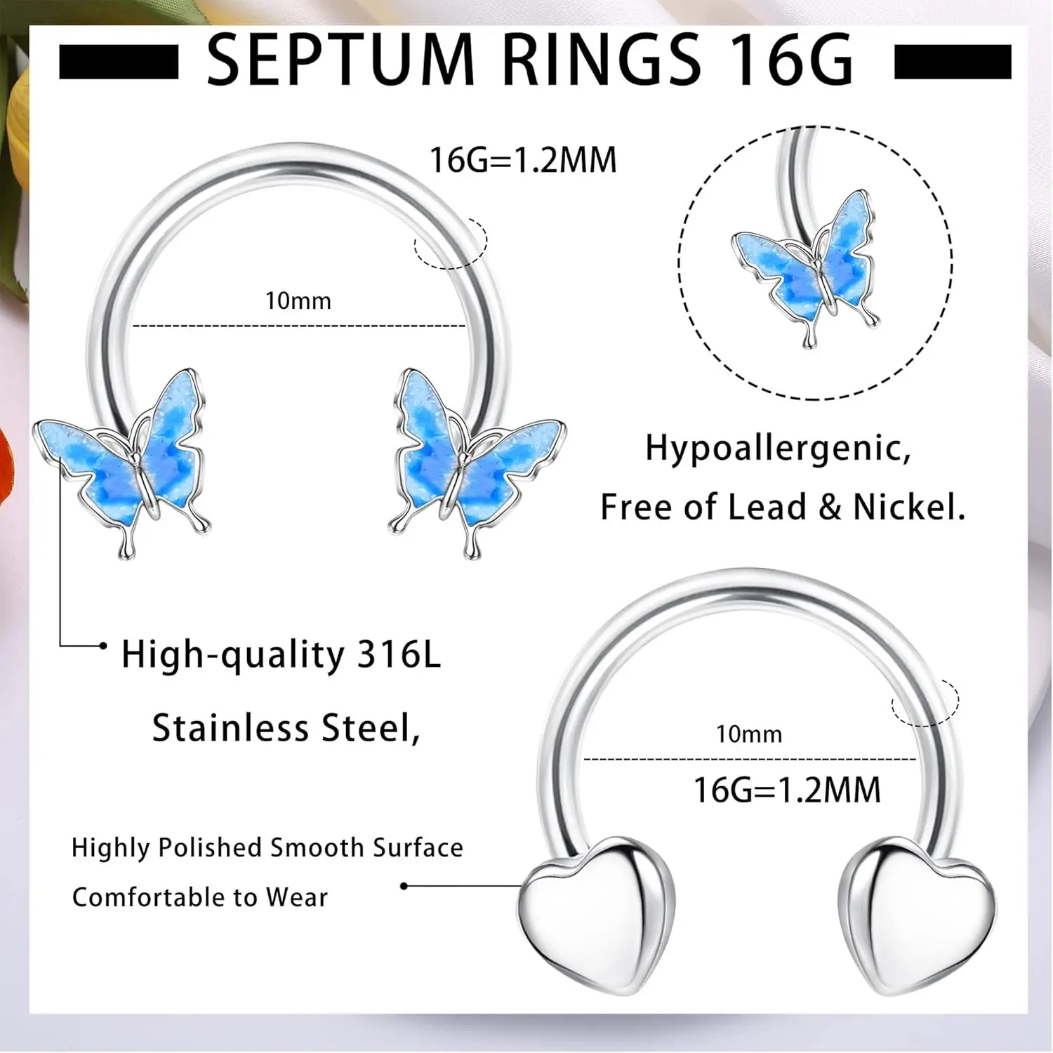 ·Suitable Size: Each piece of our horseshoe septum rings is 16 gauge (1.2 mm) with an inner diameter of 10 mm (3/8") and a ball/tip size of 3 mm, making them easy to insert and remove.