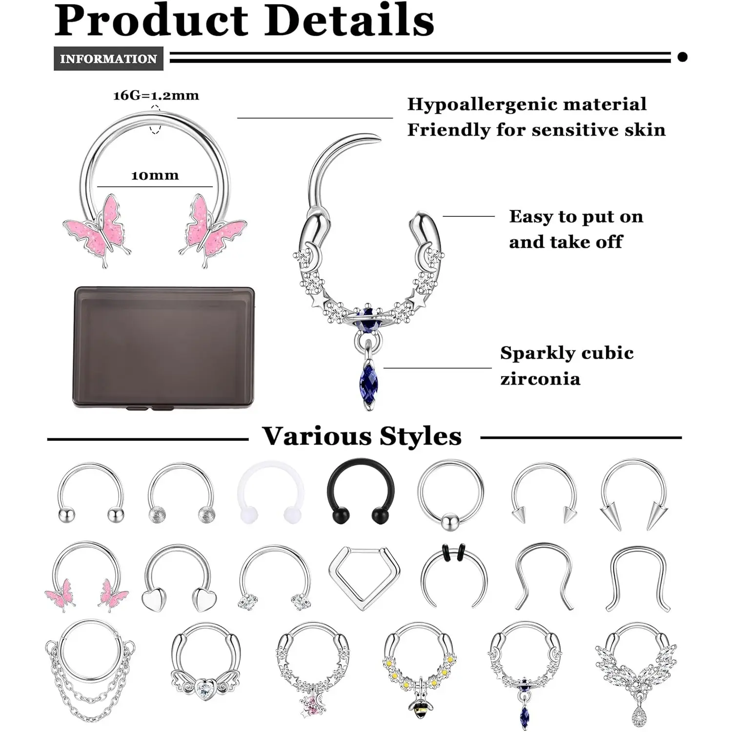 ·Styles: Suitable for multiple piercings, including cartilage piercings, helix piercings, daith piercings, tragus piercings, rook piercings, lip piercings, eyebrow piercings, and more.