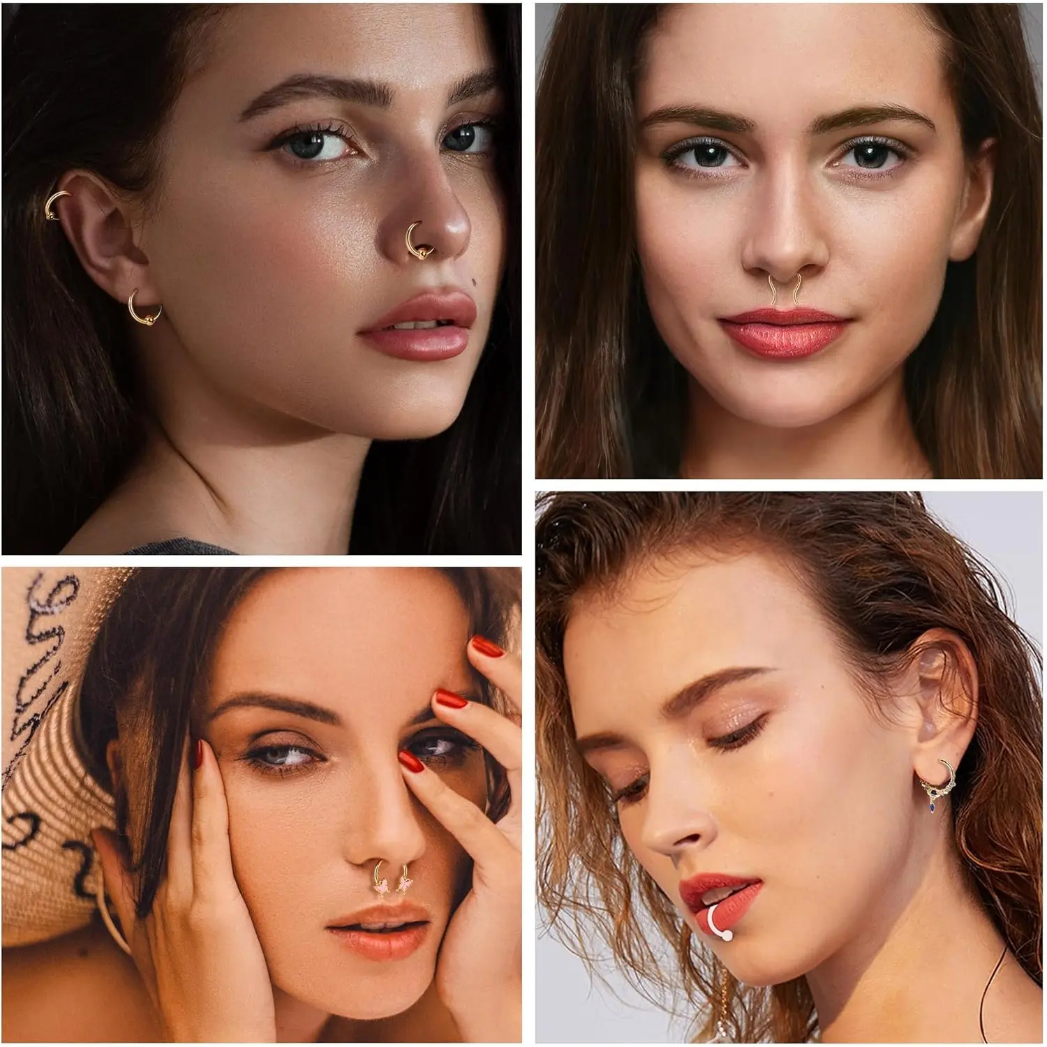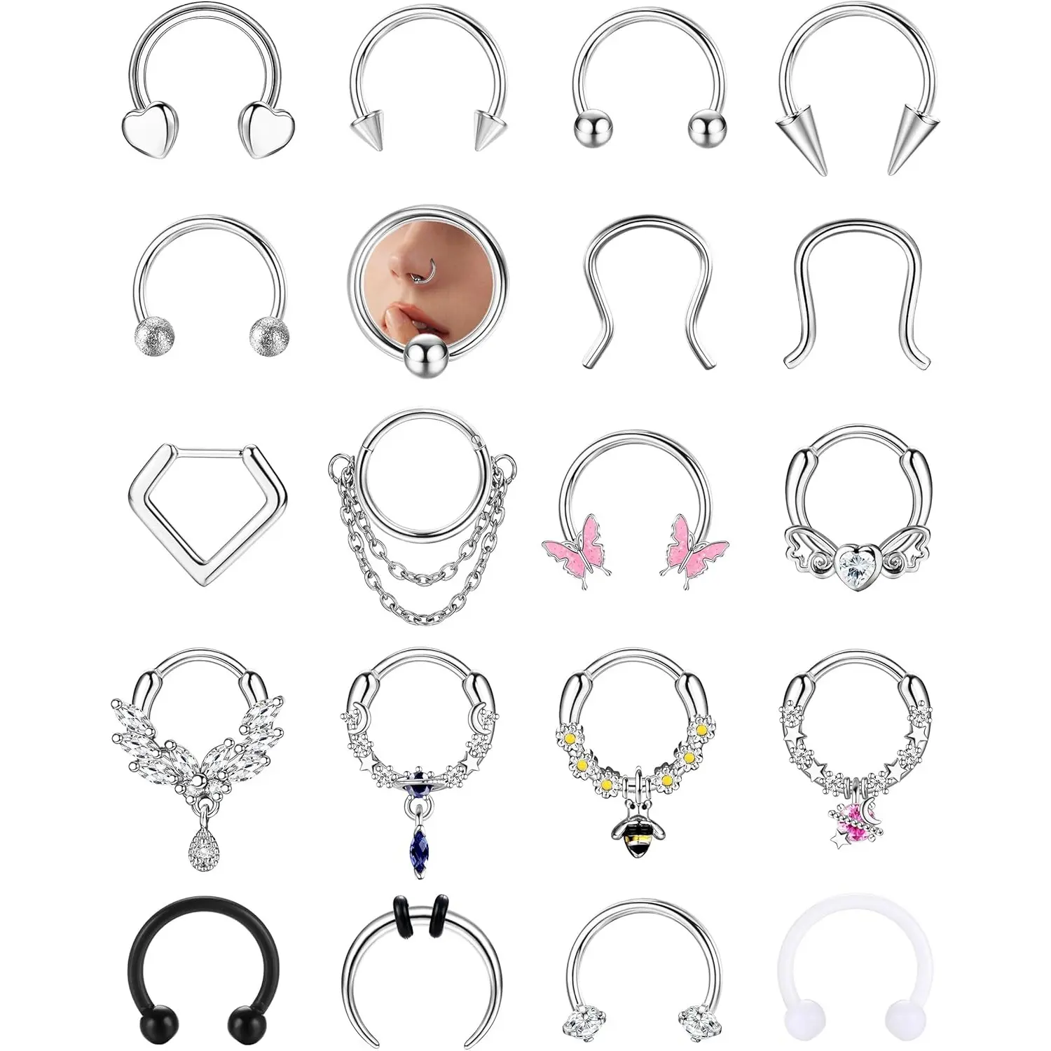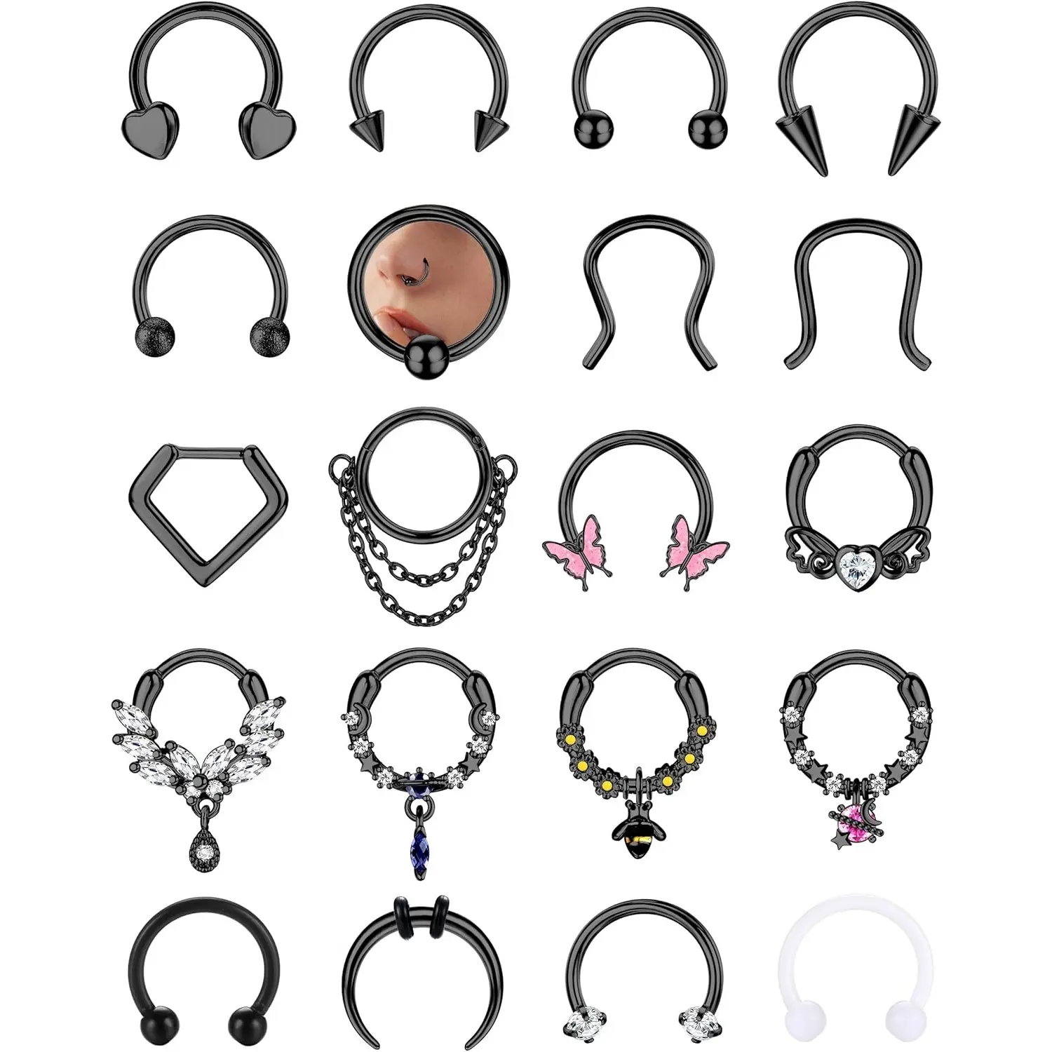 ·Versatility: These septum rings can be used as nose rings, cartilage earrings, helix earrings, tragus piercing jewelry, rook piercing jewelry, lip piercing jewelry, and eyebrow piercing jewelry.