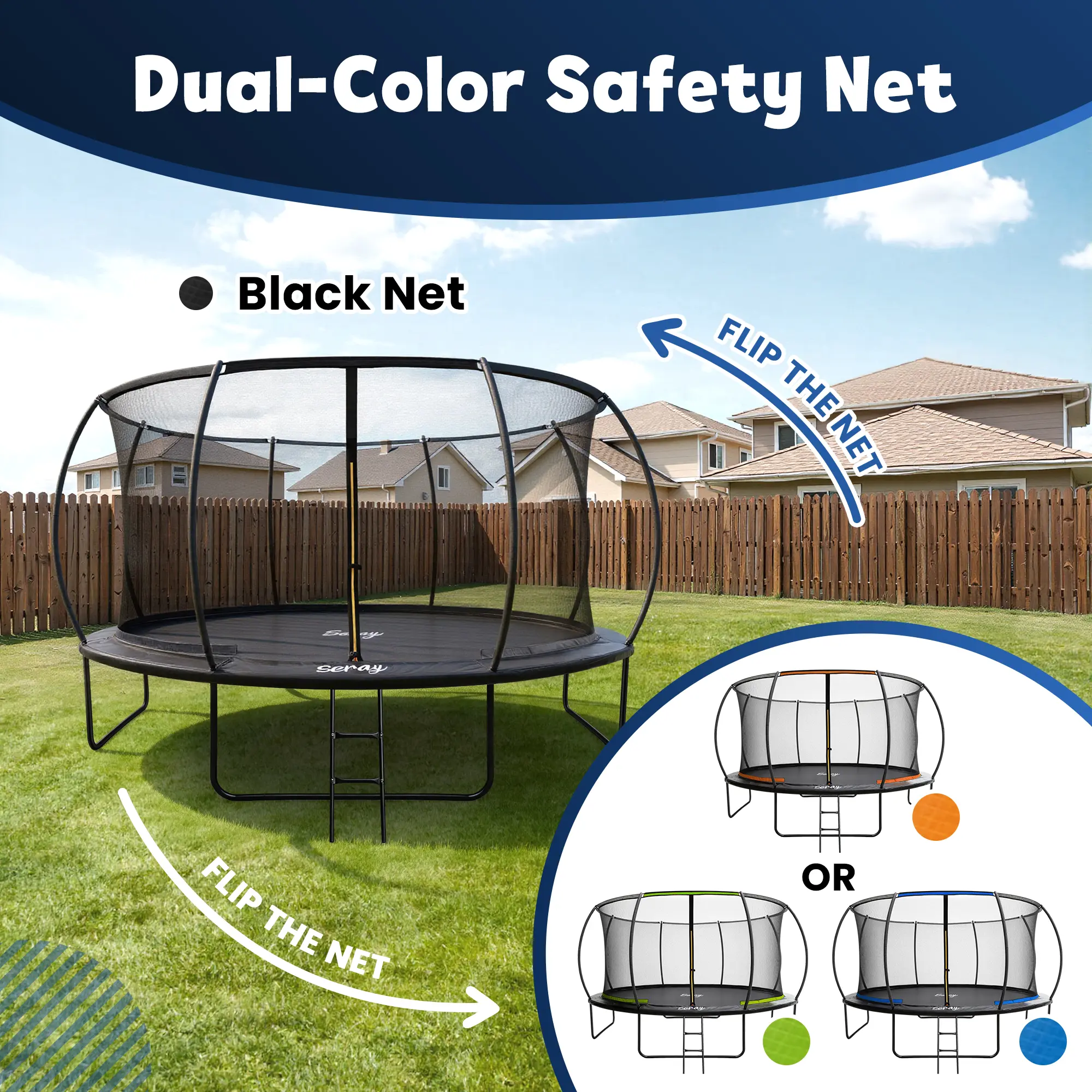 5. Seray 10-14FT Recreational Trampoline with Safety Enclosure Net and Ladder, Anti-Rust Coating & ASTM Approved, Reversible Outdoor Trampoline for Kids and Adults, Backyard Family Fun, Birthday Gift Ideas