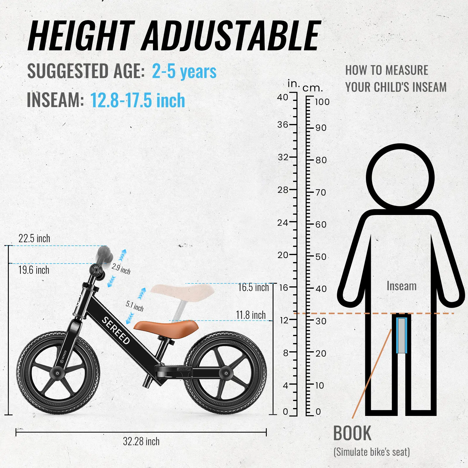 ·STURDY AND SAFE- What you think for your kids is what SEREED toddler balance bike have. Wide and tough carbon steel frame, supports up to 110 lbs, safe footrest pad, rubber grips, soft saddle and a 11.8 inch starting seat height, let your little one enjoy cycling at an early age!