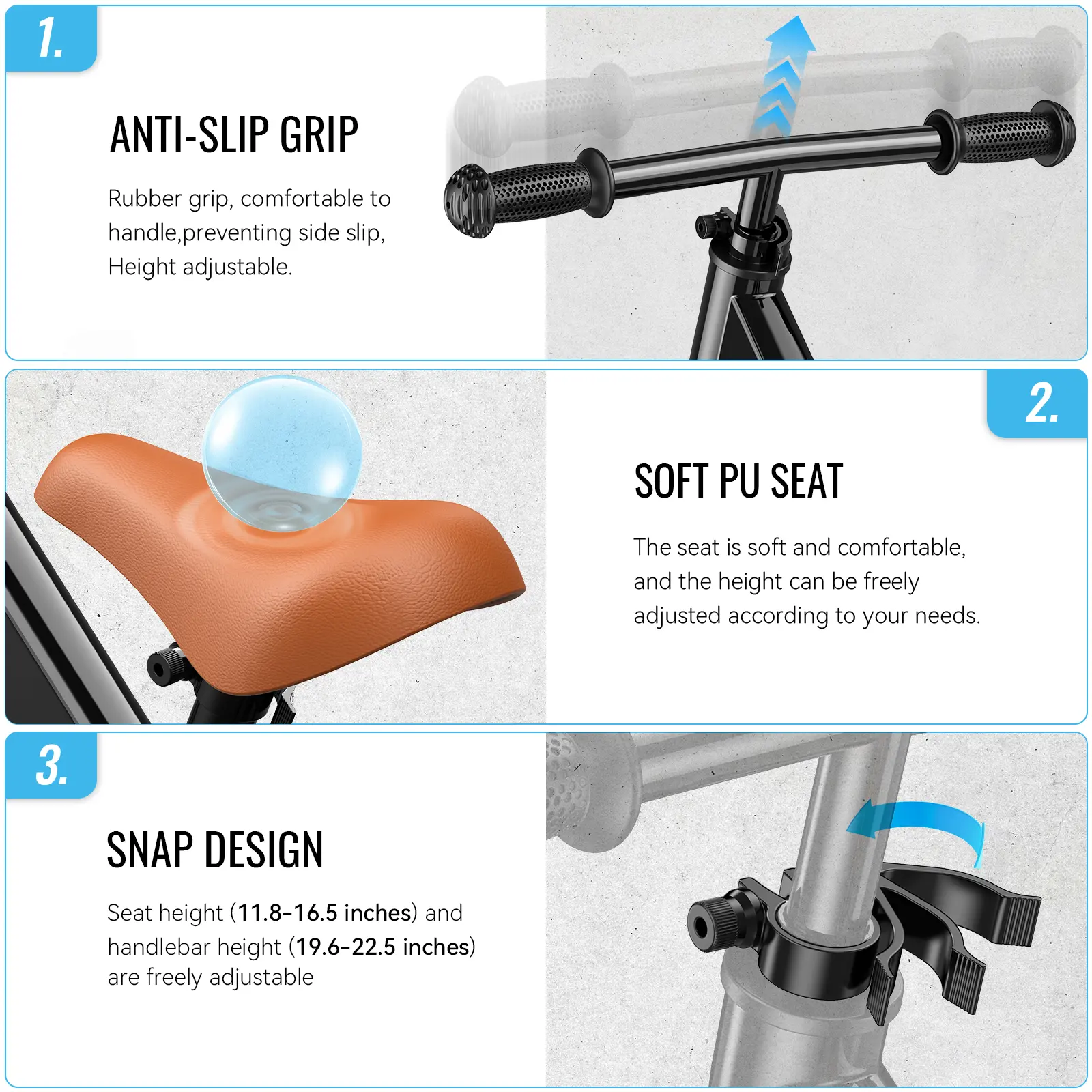 ·GROW WITH KIDS- Equipped with quick-release mechanism, parents can adjust the seat height(11.8-16.5inch) and handlebars height(19.6-22.5inch) without tools, easily adjust to the most suitable height for your child.