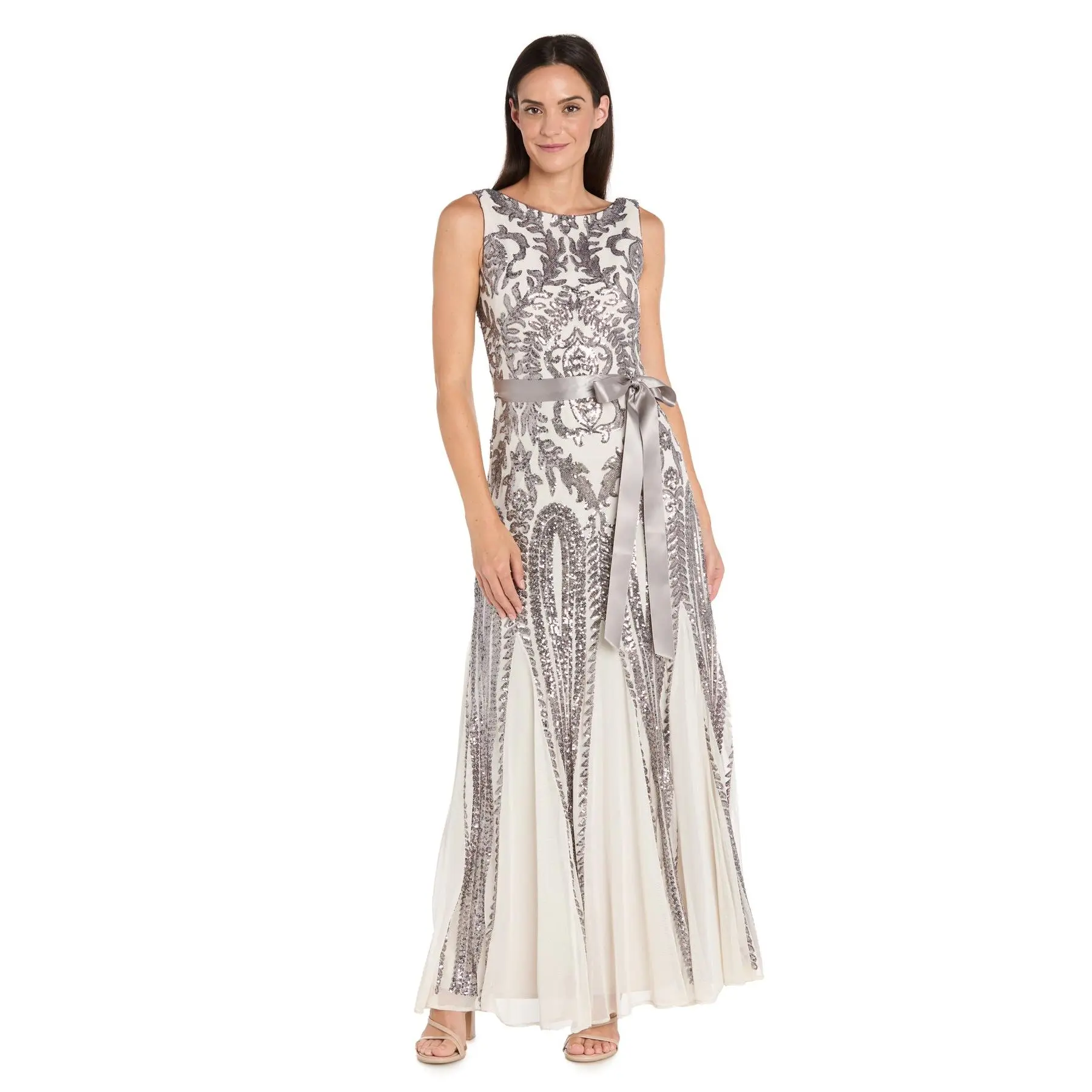 This breathtaking gown features intricate silver embellishment layered over a soft ivory base, creating a luminous, elongated silhouette. Designed with a classic sleeveless neckline and a fitted bodice, it beautifully highlights the waist with a satin ribbon tie that adds a touch of softness and elegance. The flowing skirt drapes effortlessly to the floor, combining delicate movement with refined structure. Perfect for formal evenings, weddings, or black-tie occasions, this gown offers timeless glamour with a modern, graceful finish.
