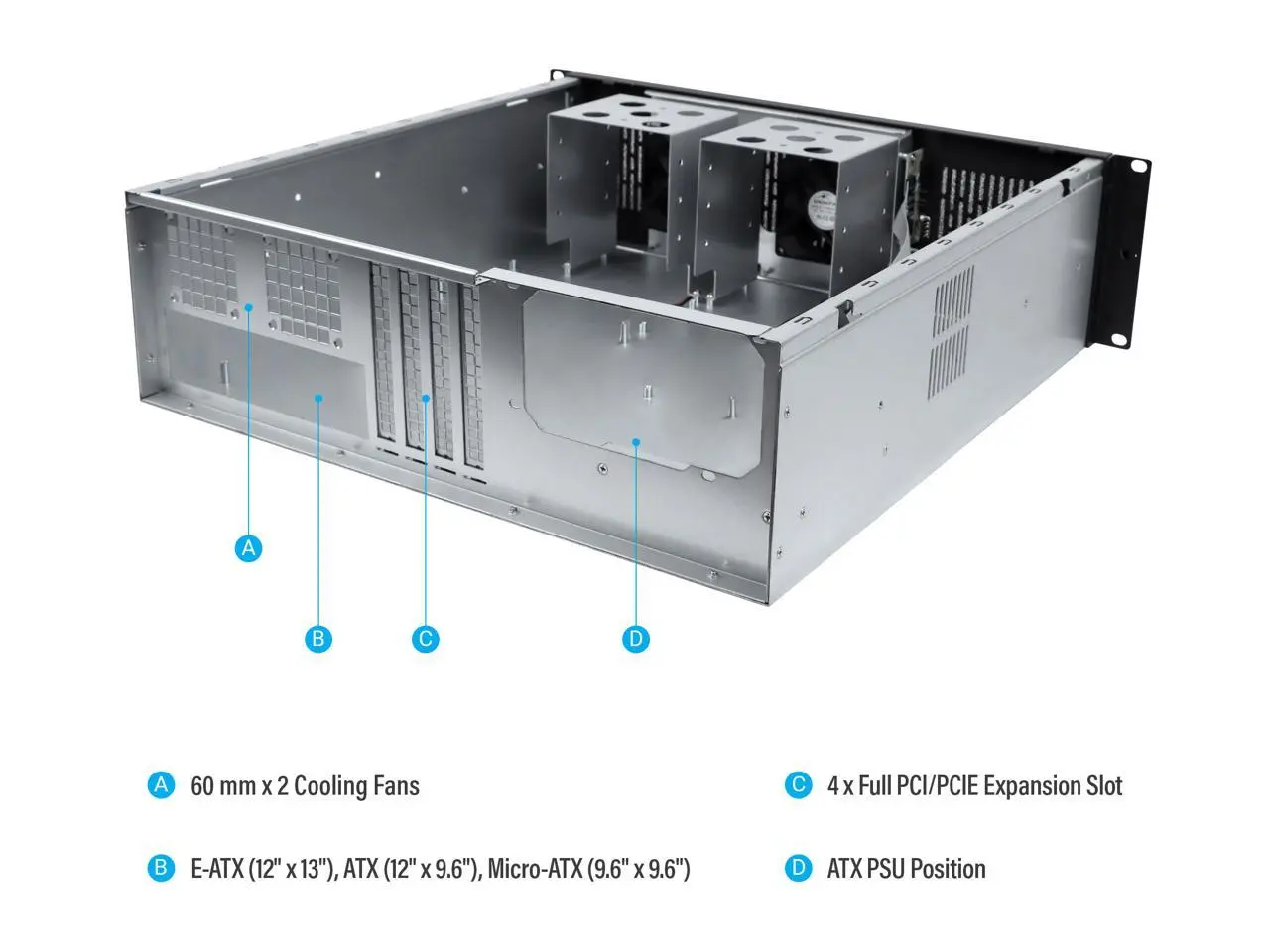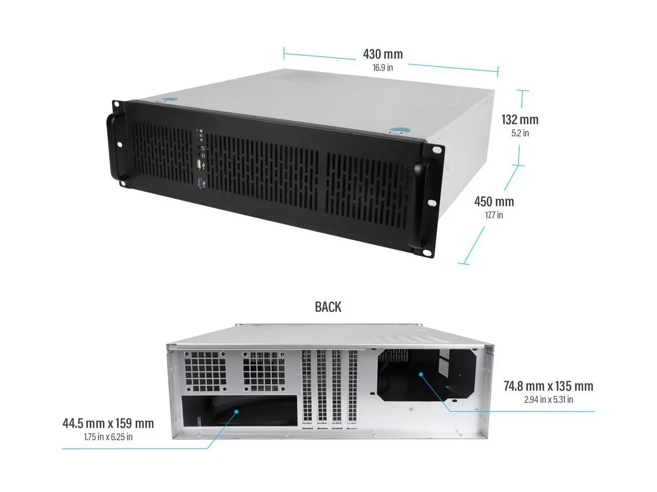 Rosewill RSV-Z3200U 3U Server Chassis Rackmount Case, 6x 3.5" Bays, E-ATX Compatible, 2x 80mm Fans, 1x USB 3.0, 1x USB 2.0, Silver/Black