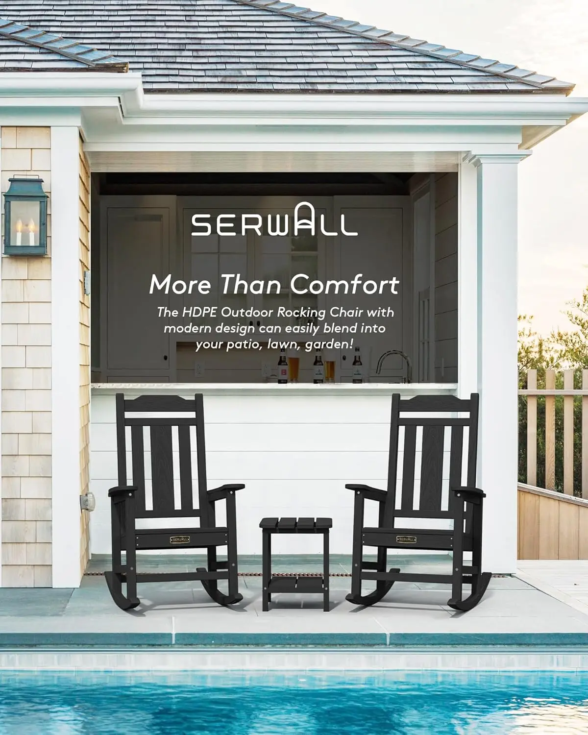 ·【HDPE Rocking Chair】 Made of premium HDPE(High-Density Polyethylene) material, this poly rocking chair makes up the disadvantages of the wood and PS rocking chair, it is more durable and sturdy, which can stand the test of time. Along with its wood like texture, making SERWALL rocking chair more like real wood.