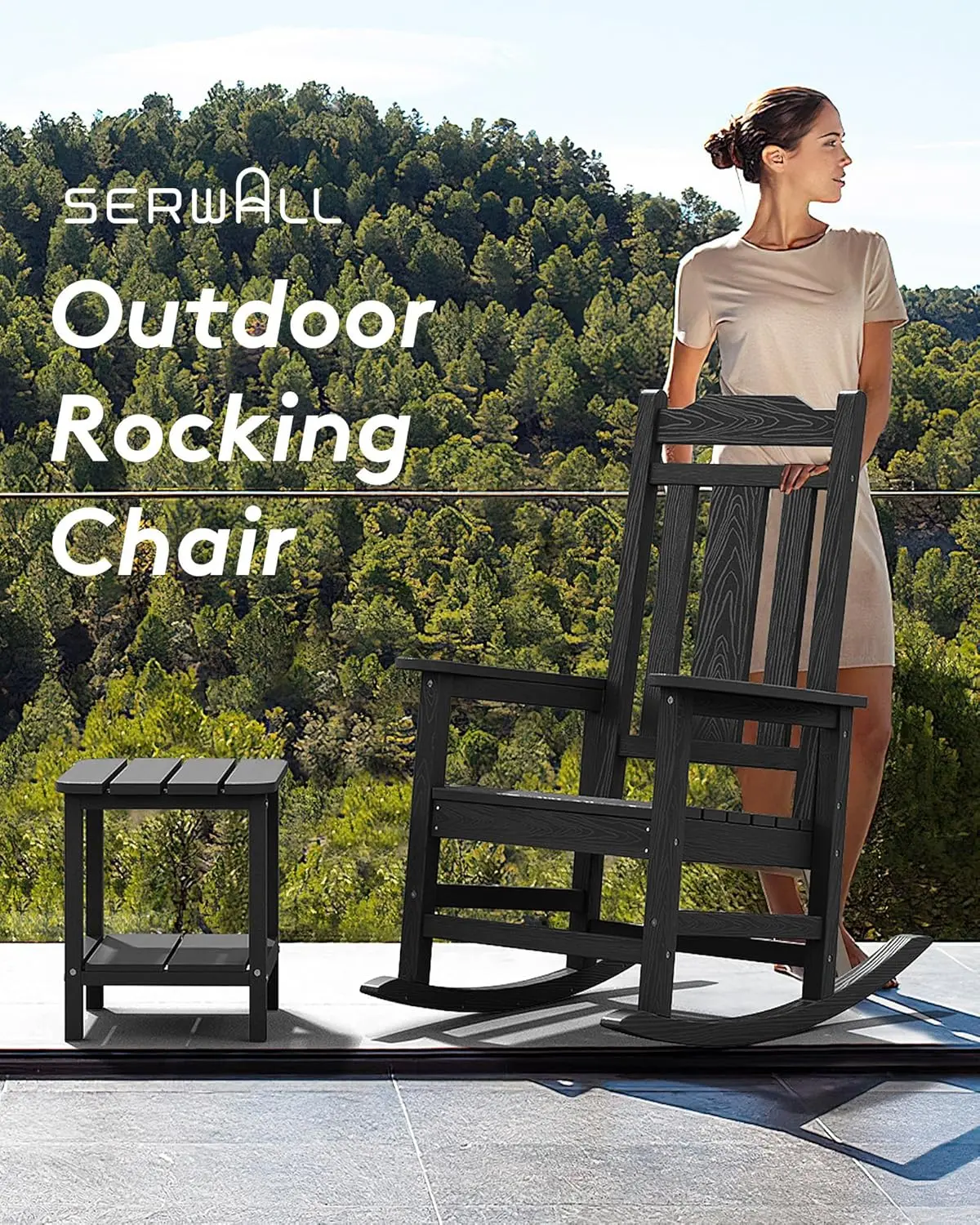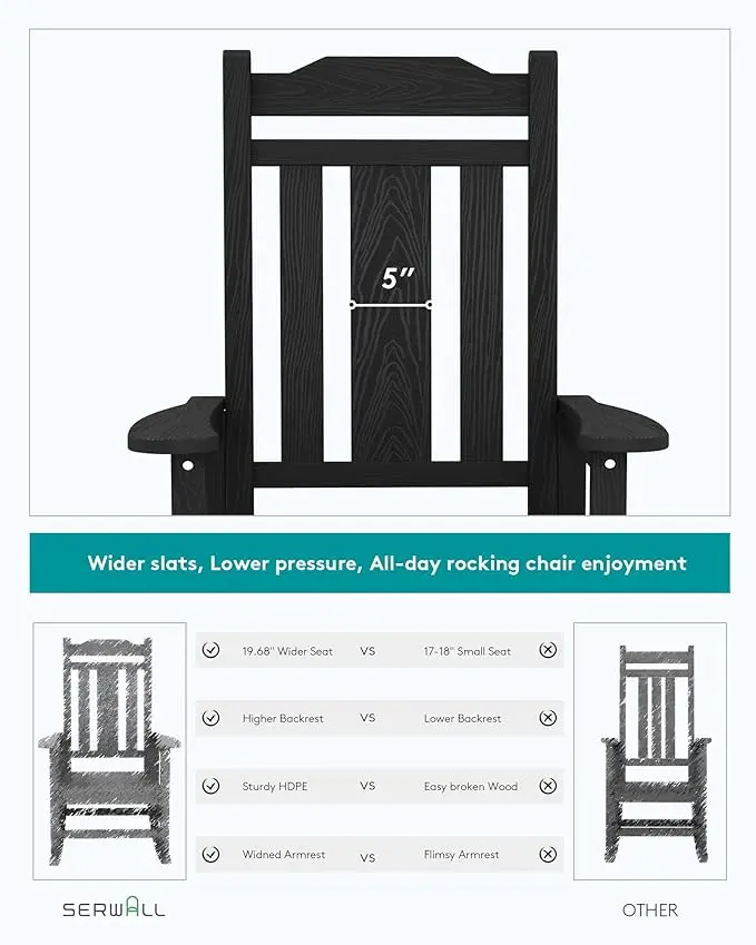 ·【Comfortable Rocking Chair】Comfort is our primary focus. SERWALL outdoor rocking chair is designed with an ergonomic shape, comfortable seating, and a supportive backrest to ensure a relaxing experience.