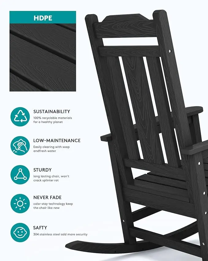 ·【Weather Resistance】Enjoy outdoor relaxation without interruption. Our front porch rocking chairs are less prone to warping, fading, or rusting, ensuring that your rocking chair remains in good condition and free from the various weather conditions.