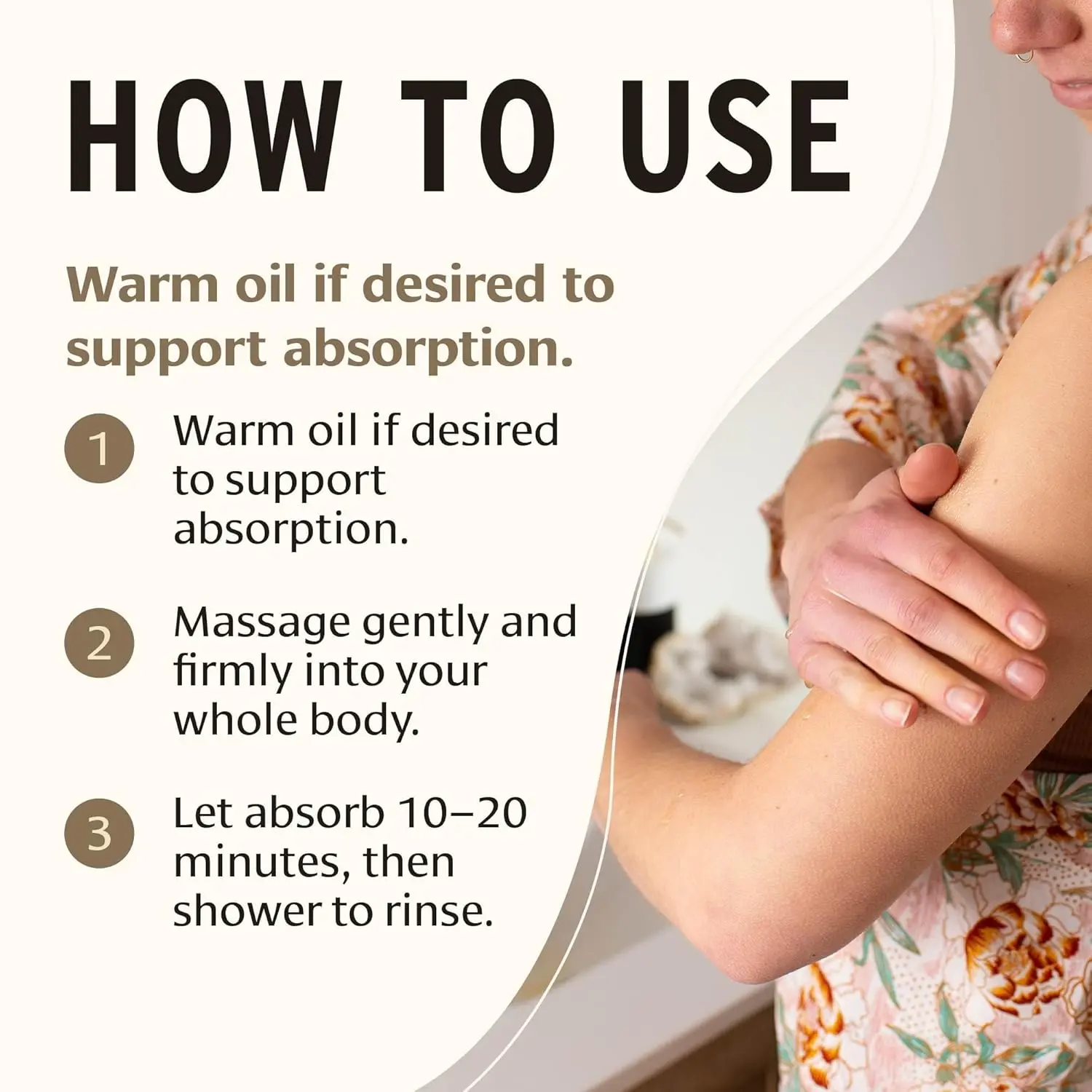 I use this oil to hydrate my skin and then lightly shower after waiting about 30 min. The oil completely softens and nourishes my skin and it feels great!
