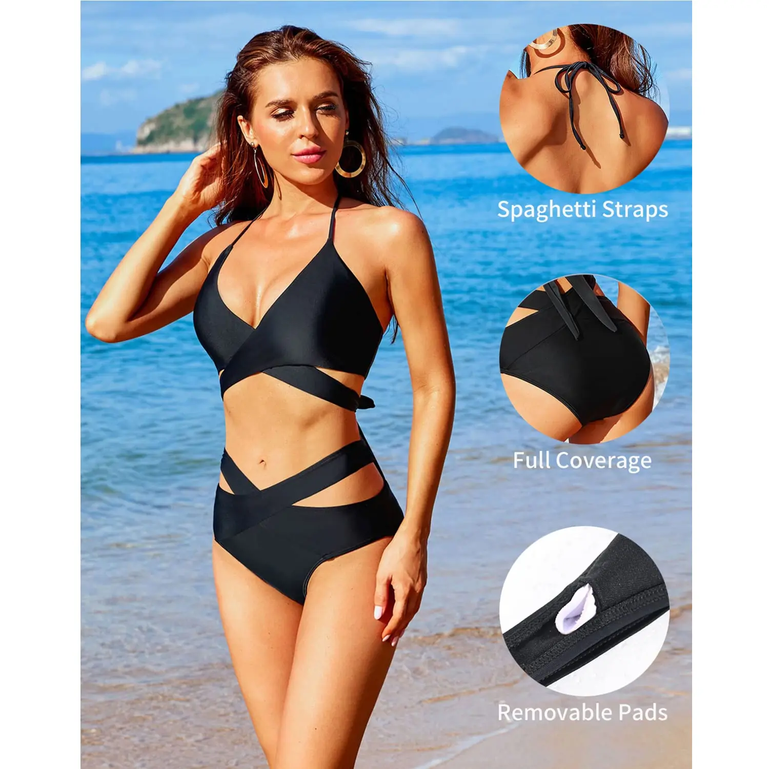 ·Bikini Top: Triangle wrap bandage bikini top with removable padded bra, halter neck, and front cross ties for double support on the chest.