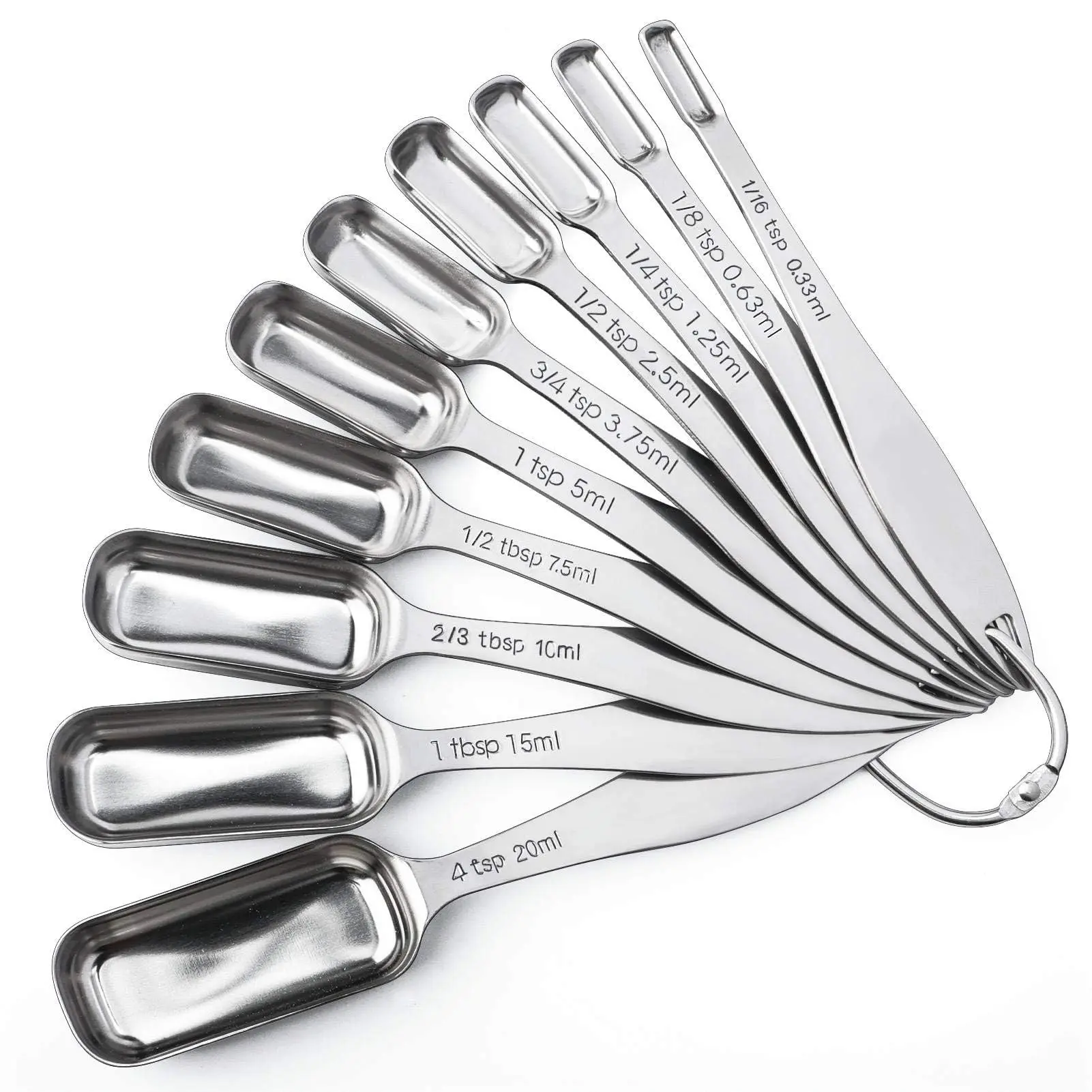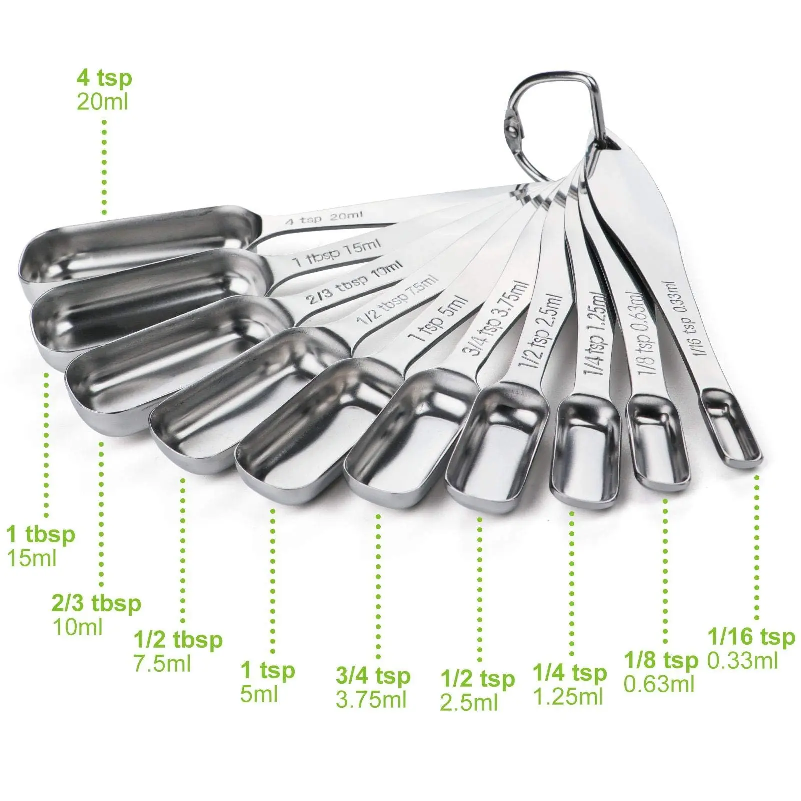 ·Set of 10 Piece: Measuring spoons stainless steel set Including 1/16 tsp, 1/8 tsp, 1/4 tsp, 1/2 tsp, 3/4 tsp, 1 tsp, 1/2 tbsp, 2/3 tbsp,1 tbsp, 4 tsp, come in multiple sizes to match your cooking need