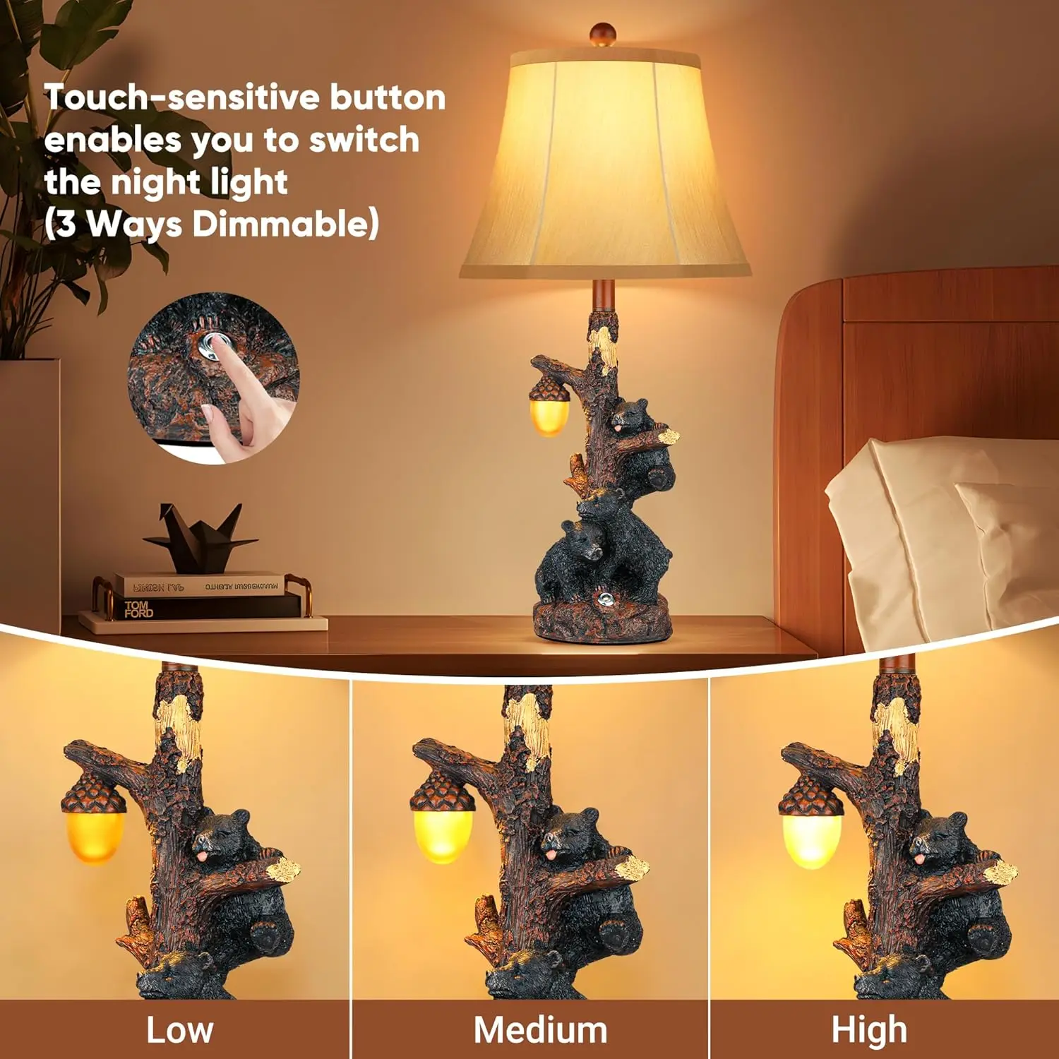 ·Dual lighting system:The charming night light on the branch offers adjustable brightness settings—low, medium, and high—allowing you to create the perfect atmosphere for any occasion. Easily operate this feature using the touch switch conveniently located at the base of the lamp.The main light positioned at the top is controlled through a stylish knob switch, providing a steady glow suitable for reading or work tasks (not dimmable). Crafted with both functionality and aesthetics in mind, these table lamps seamlessly blend with various décor styles while adding a touch of sophistication to your home.