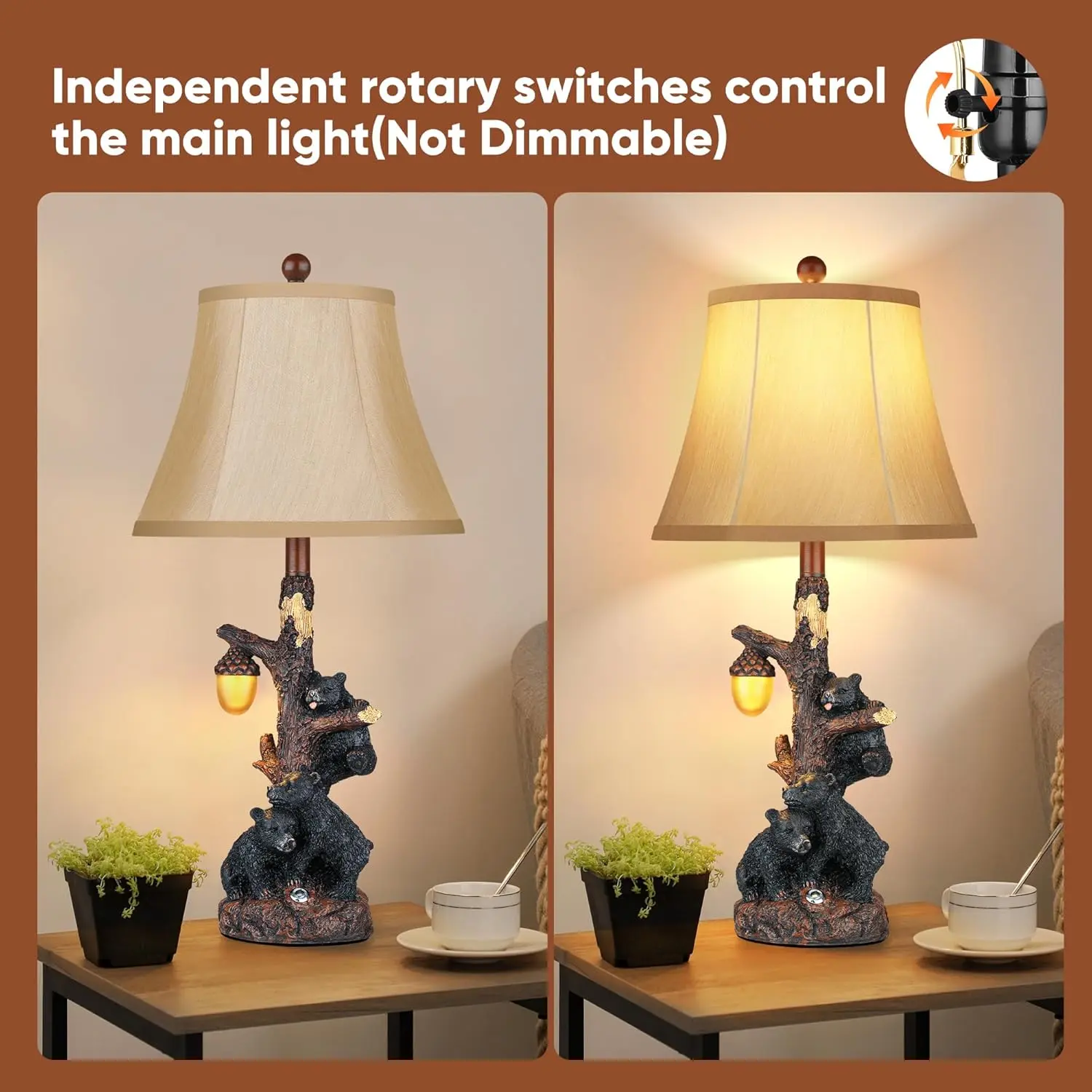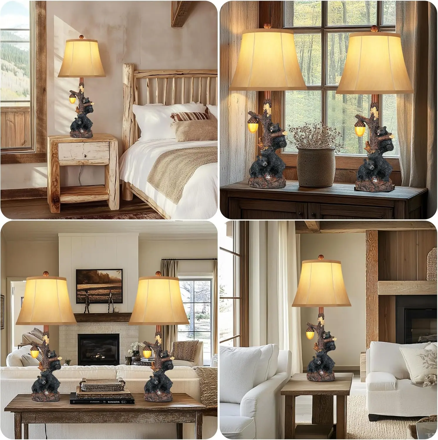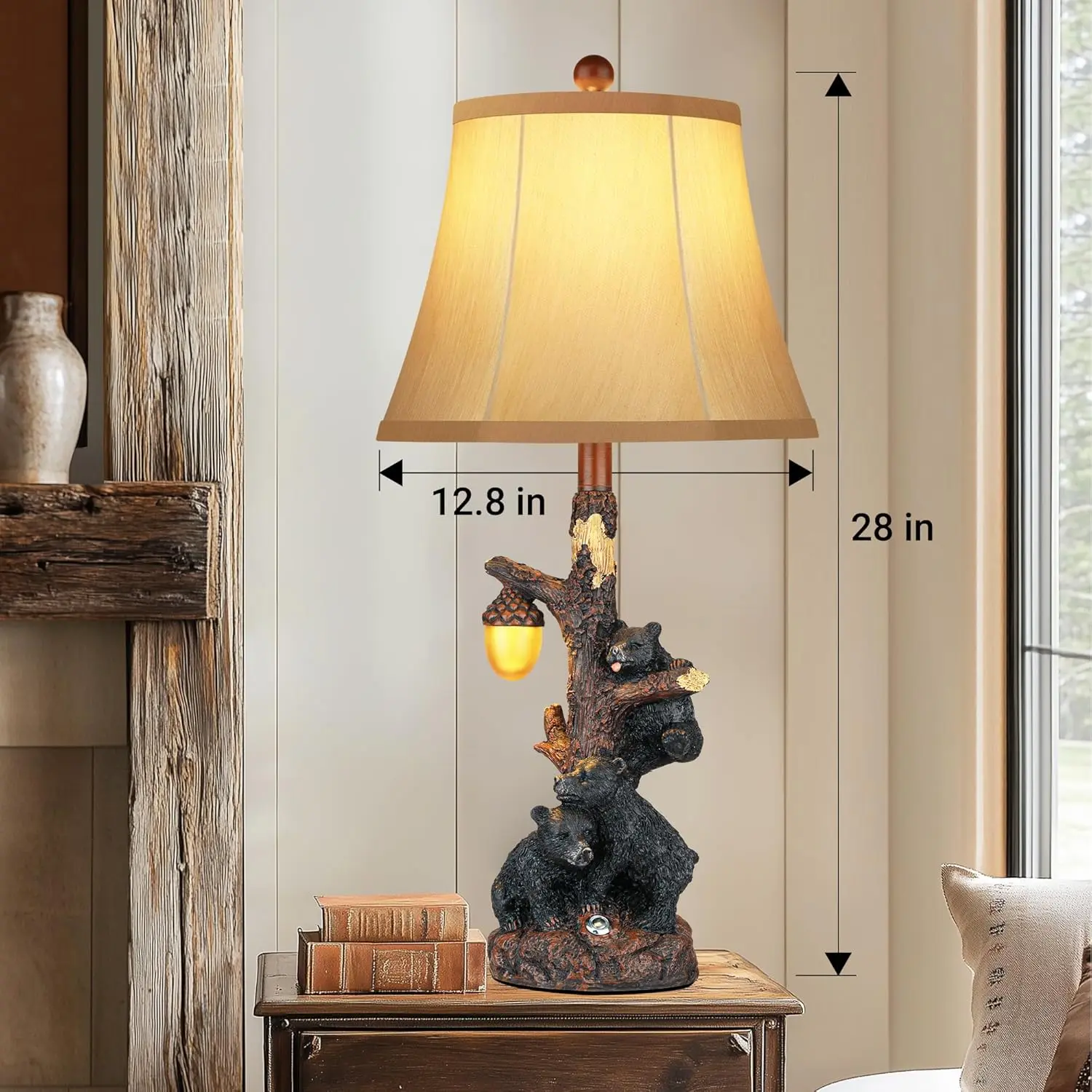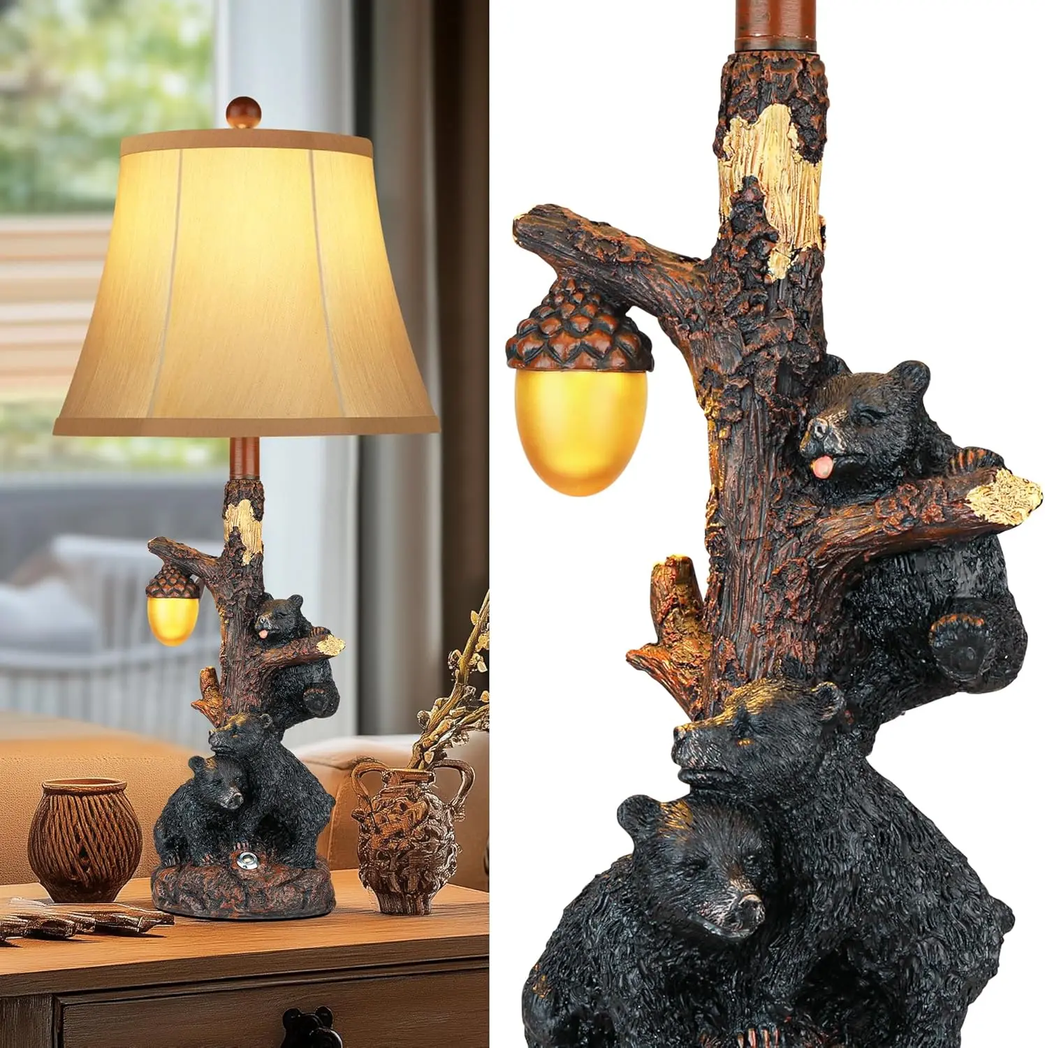 ·A charming addition to any western setting:This beautifully crafted table lamp boasts a solid wooden trunk base, meticulously carved to capture the intricate details of real tree bark. Each knot and branch is artistically designed, adding a touch of authenticity and warmth that enhances the rustic ambiance of any room.Ideal for creating a cozy farmhouse setting, the lamp also features a convenient night light, providing gentle illumination for those serene evenings. Whether placed in a living room, bedroom, or office, the bear table lamp serves as a delightful accent piece that complements your decor style while offering ample lighting for reading or relaxation.
