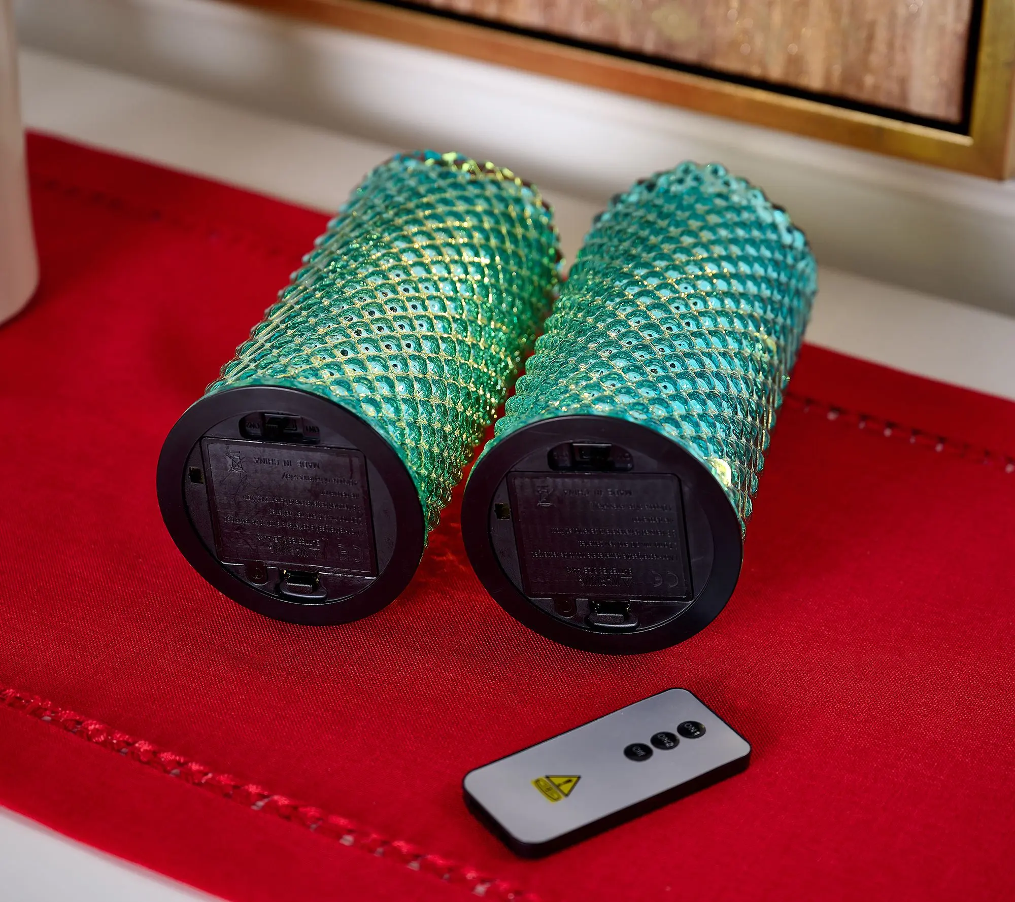 Set of 2 made of mercury glass with a textured diamond pattern. Each candle illuminates both from within and on the flame tip.  Two lighting options w/remote & timer @QVC, Inc #glasscandle #flamelesscandle #homedecor #luxurydecor #holidaydecor