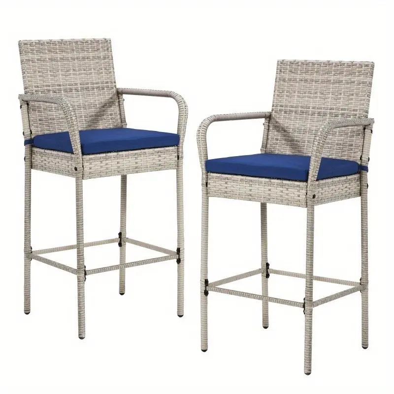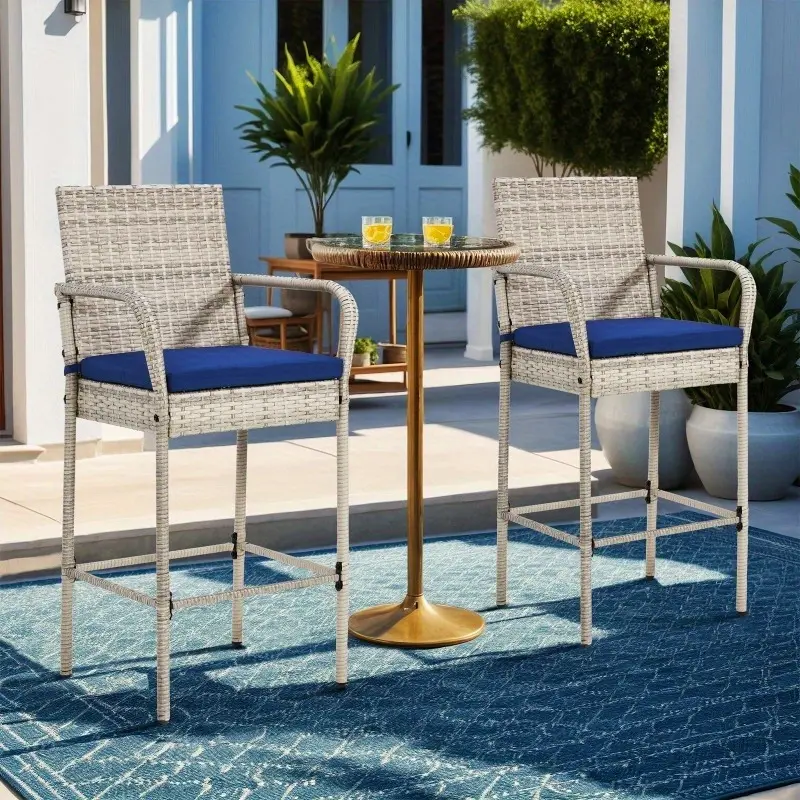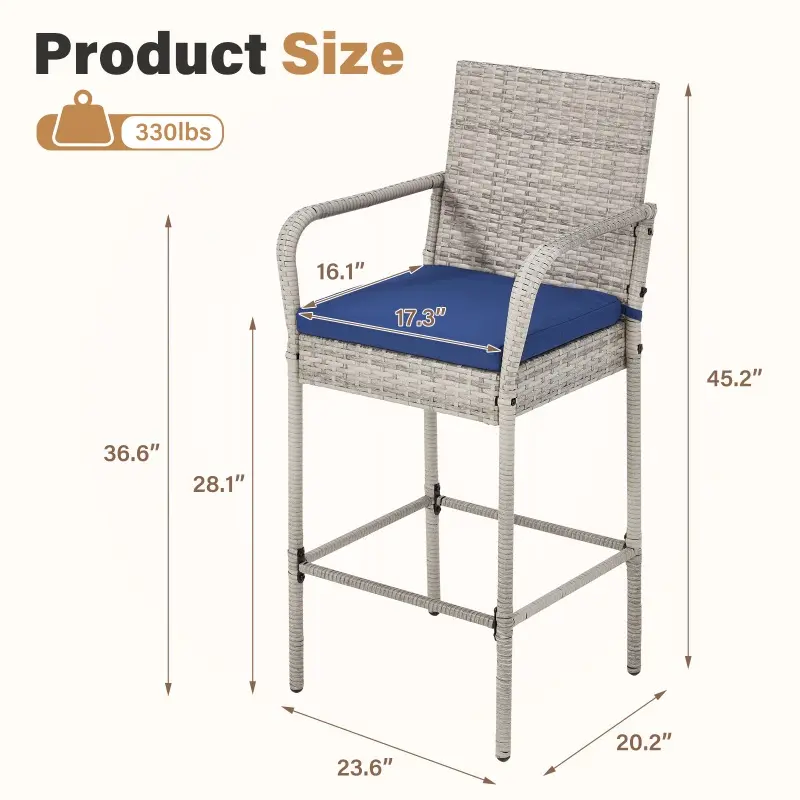 Durable Design: Featuring heavy-duty iron frames wrapped in fade-resistant, UV-protective PE rattan, these outdoor barstools are built to withstand outdoor conditions while offering long-lasting stability and strength. Designed to maintain their beauty for years, they are a perfect addition to any outdoor space.