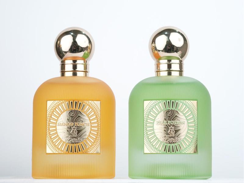 10/20; Pressurized atomizers; beautiful weighted green & orange hue glass bottles shaped like mini Patrón bottles, w/ gold title squares, one w/ green accents the other w/ orange accents. Heavy gold tops, but be careful bc they aren’t magnetic & the bottles will drop if you pick them up by the caps. Photorealistic scents of Pear & Mango. PP is creamy & sweet from the caramel note. MP has more floral & citrus notes, & slightly more complex w/ cedarwood. They both have musk in the dry down which elevates the parfums to grown folk status. Both are JUICY!!! Layered together or w/ Confection, YES!