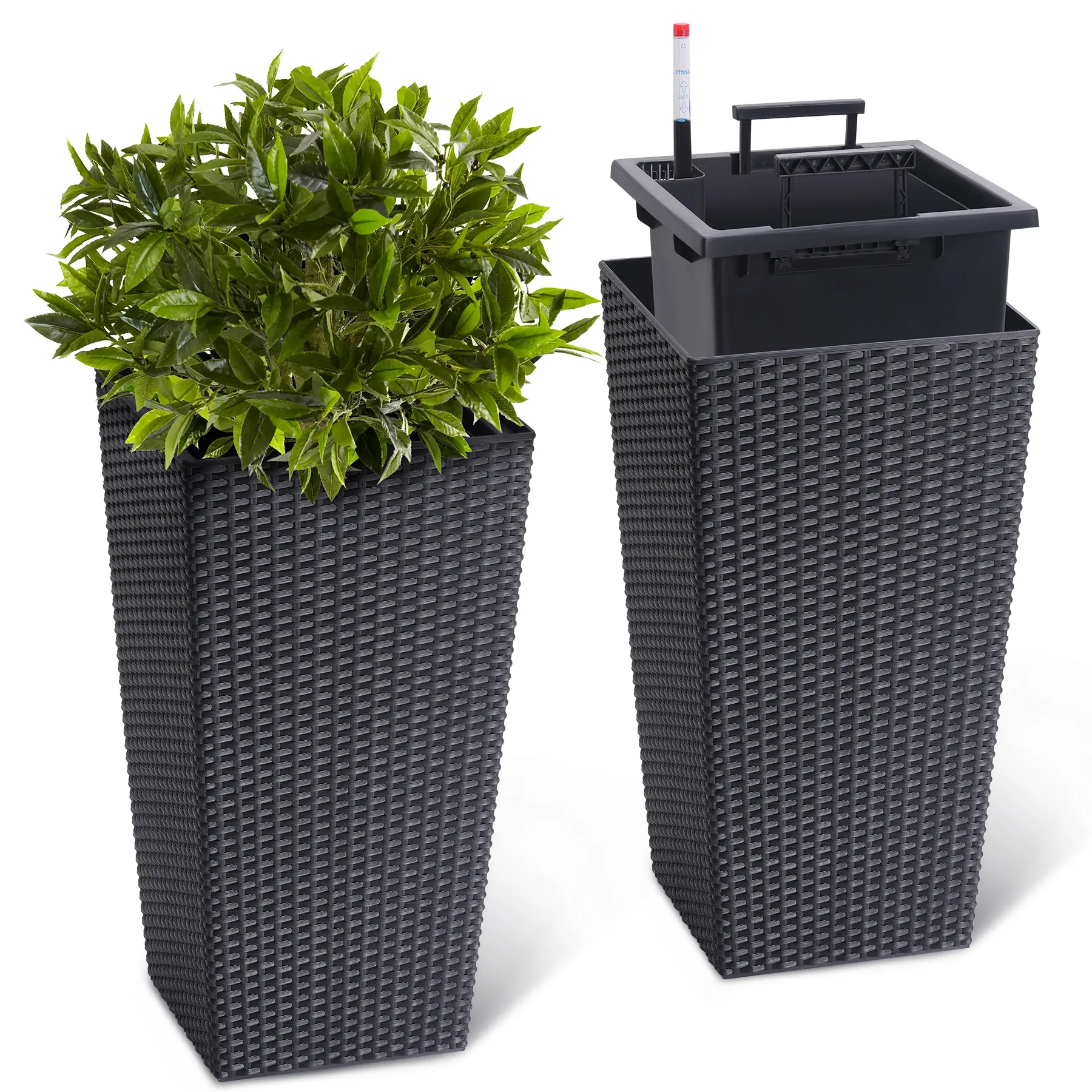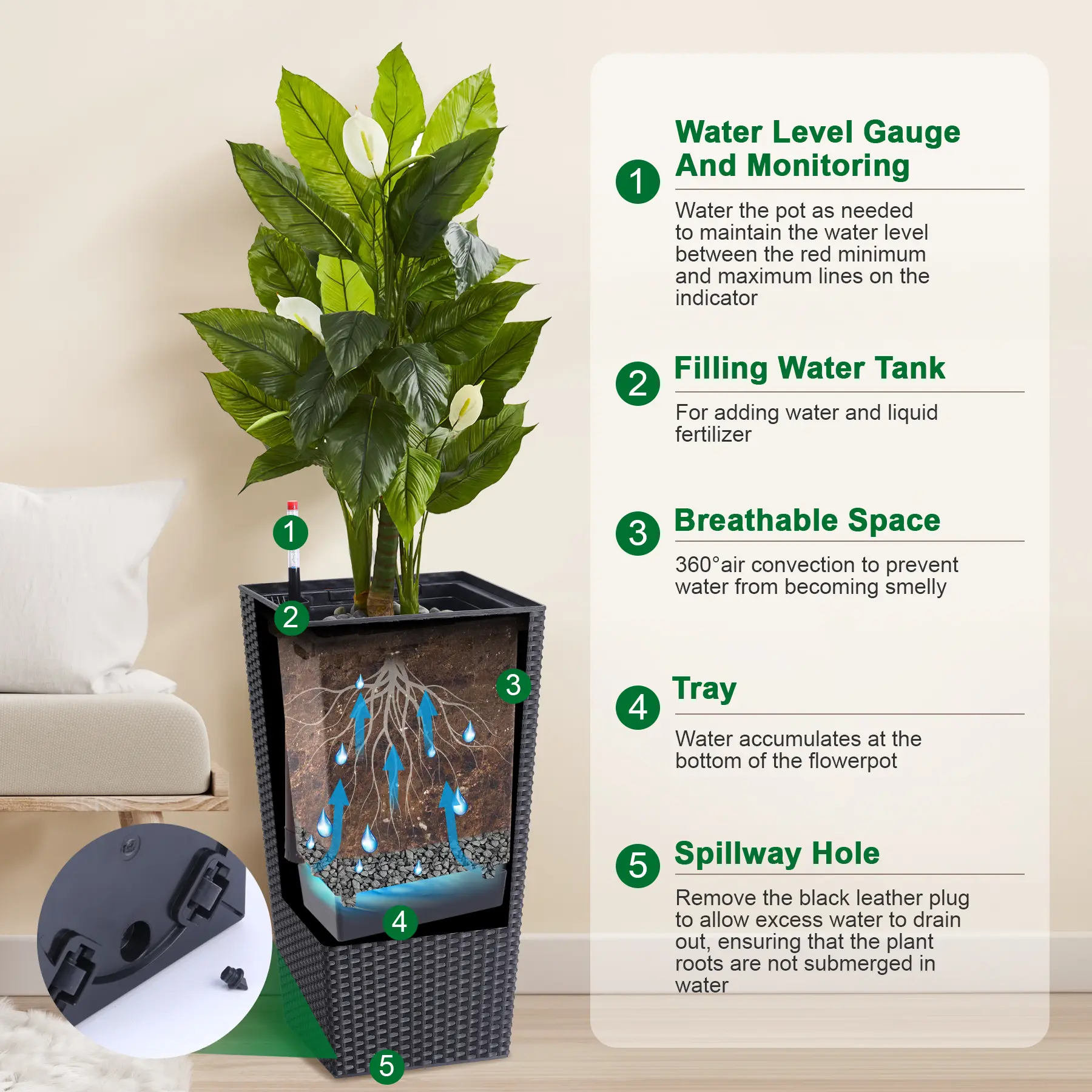 ·1.Self-watering tall rattan planters with water level monitor for easy plant care and up to 2 weeks between waterings.