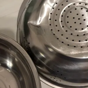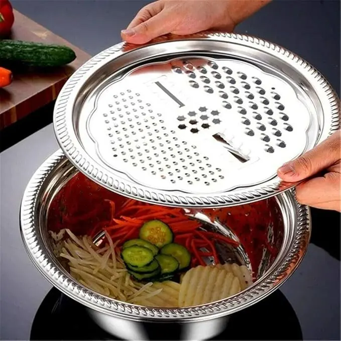 This is very thin material and when it arrived, it had dents all in it. Not very sturdy, you can almost bend the metal with your fingers! I would not recommend this. It looks so much bigger online than it actually is! Paid way too much for it! Probably will dent on hard vegetables