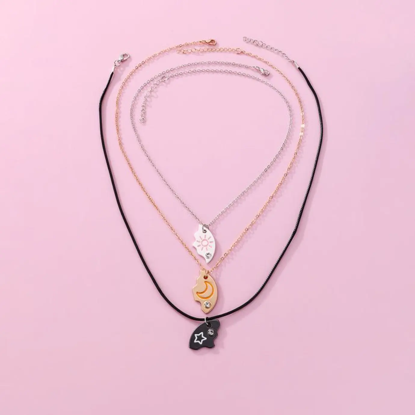 Exclusive Friendship Necklaces Set Set of 3: This exclusive 3-pack includes unique pendants: a twinkling star, a dreamy moon, and a radiant sun. Rhinestone Encrusted: Each pendant is encrusted with sparkling rhinestones, adding a touch of magic. Symbol of Togetherness: Designed to symbolize togetherness, these necklaces are perfect for sharing with your best friends. Perfect Gift for BFFs Special Gift: These necklaces are the perfect gift to show your BFFs how special they are to you. Cute Touch: The whimsical pendants add a cute touch to any outfit, making every day a celebration of friendship. Strengthen Your Bond Everlasting Friendship: Crafted with care, this necklace set is the perfect symbol of everlasting friendship. Celebrate Friendship: Don't miss the opportunity to strengthen your bond with this necklace set.