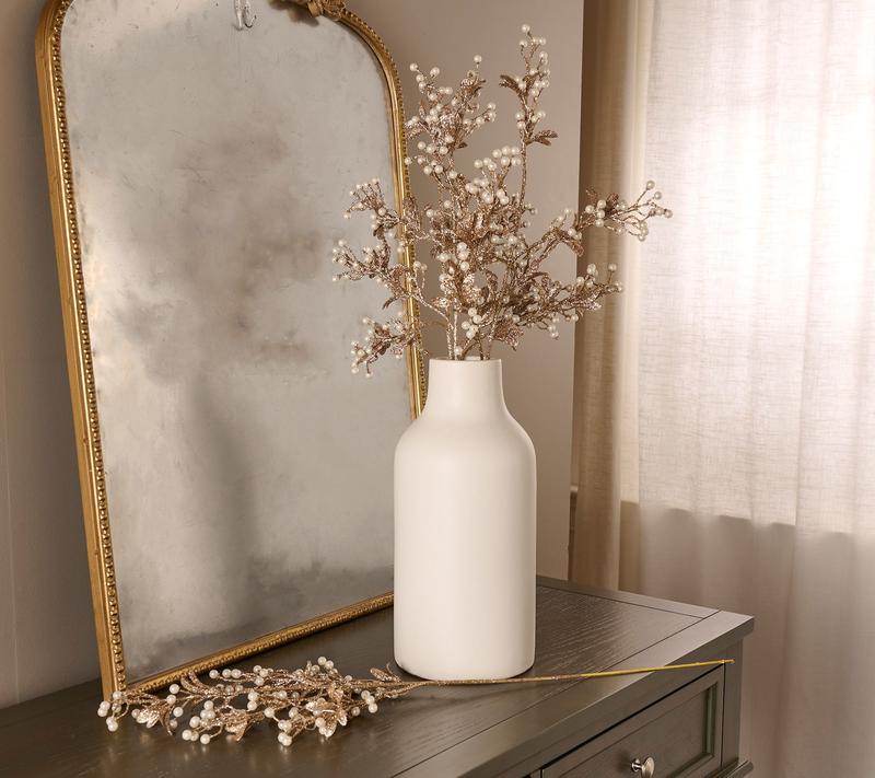 This elegant spray includes branches with glittered leaves and pearls. The spray measures 30 long. The spray is glittered and is available in your choice of color; gold or silver. The set includes 4 identical sprays. For indoor decorative use only. Imported. From The Valerie Parr Hill Collection.