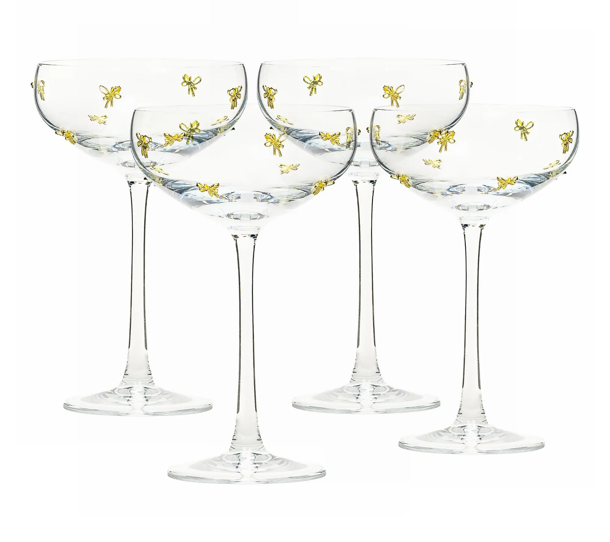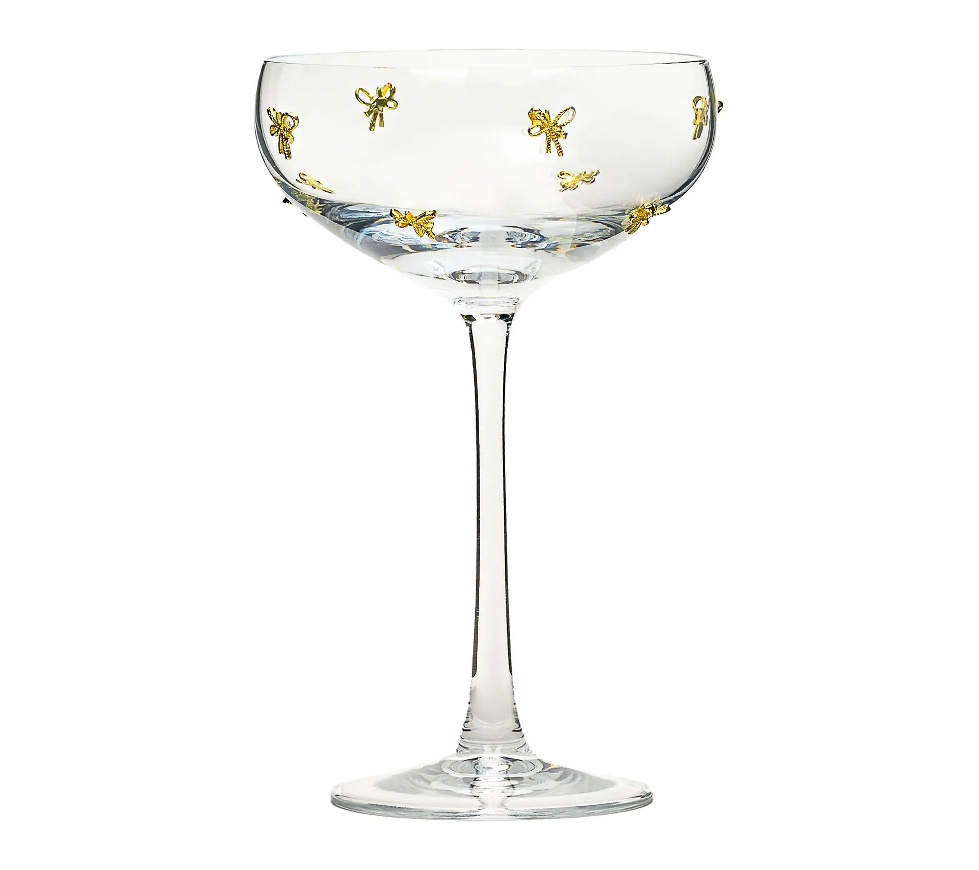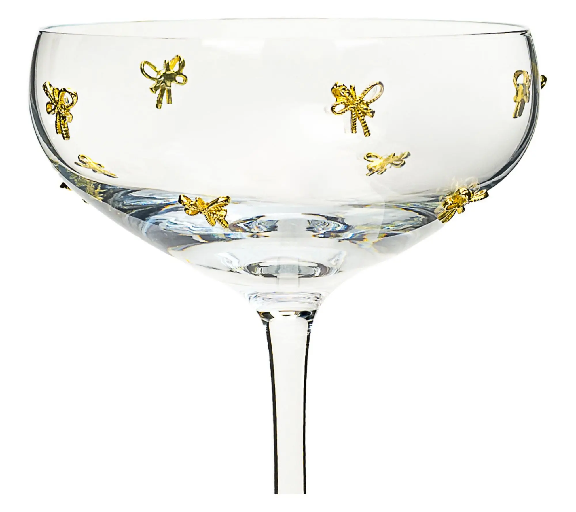 Raise a glass to joyful gatherings with this set of coupe glasses, each adorned with a gleaming gold bow charm that adds a festive touch to every celebration. Whether hosting a holiday party, bridal shower, or simply enjoying a sparkling cocktail with friends, these vintage-inspired champagne coupes bring a playful elegance to your tabletop. From 10 Strawberry Street.