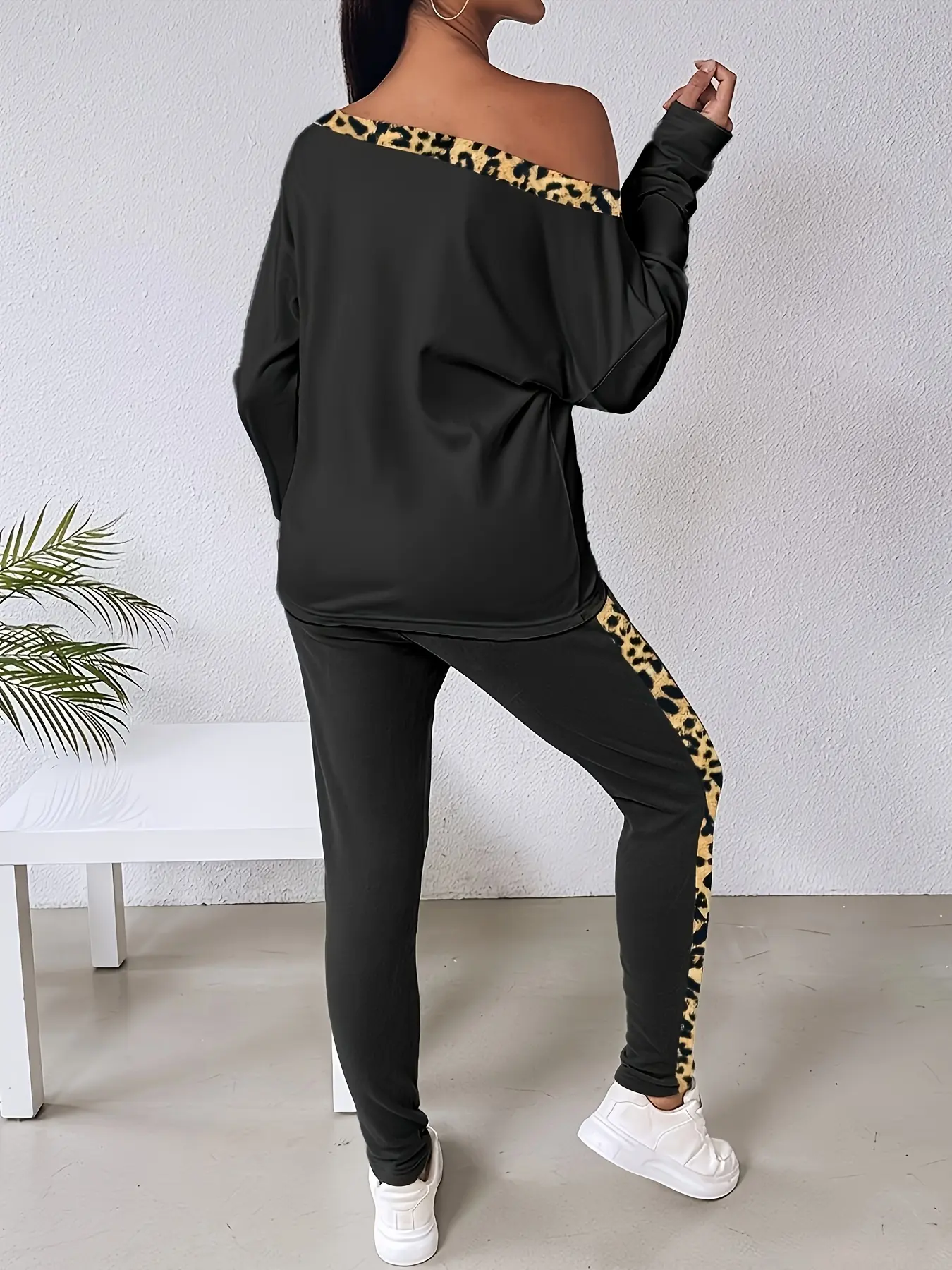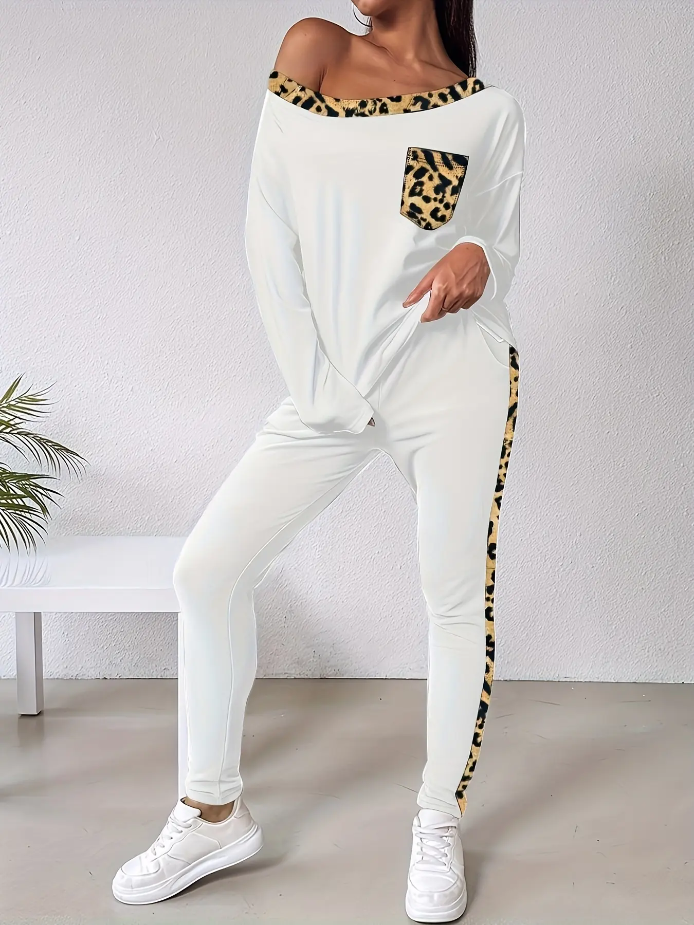 Women's Fashionable Leopard Print Long Sleeve Shirt & Lace Up Pants Set, Slanted Shoulder Collar, Daily Versatile Occasions, Home Sports Wear #tracksuit #sweatsuit #sweatsuits #sweaterset #tracksuits #lacebodysuit #womensclothingtiktokshop #widelegjumpsuit #womensjumpsuit #longsleevejumpsuit
