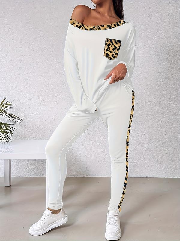 Women's Fashionable Leopard Print Long Sleeve Shirt & Lace Up Pants Set, Slanted Shoulder Collar, Daily Versatile Occasions, Home Sports Wear #sweatsuitset #cozyloungewearset #fashionablewomensclothing #loungewearsets #longsleevebodysuit #2pieceoutfit #sportyjumpsuit #tracksuitset #prettygardensweatsuit #sportwearset