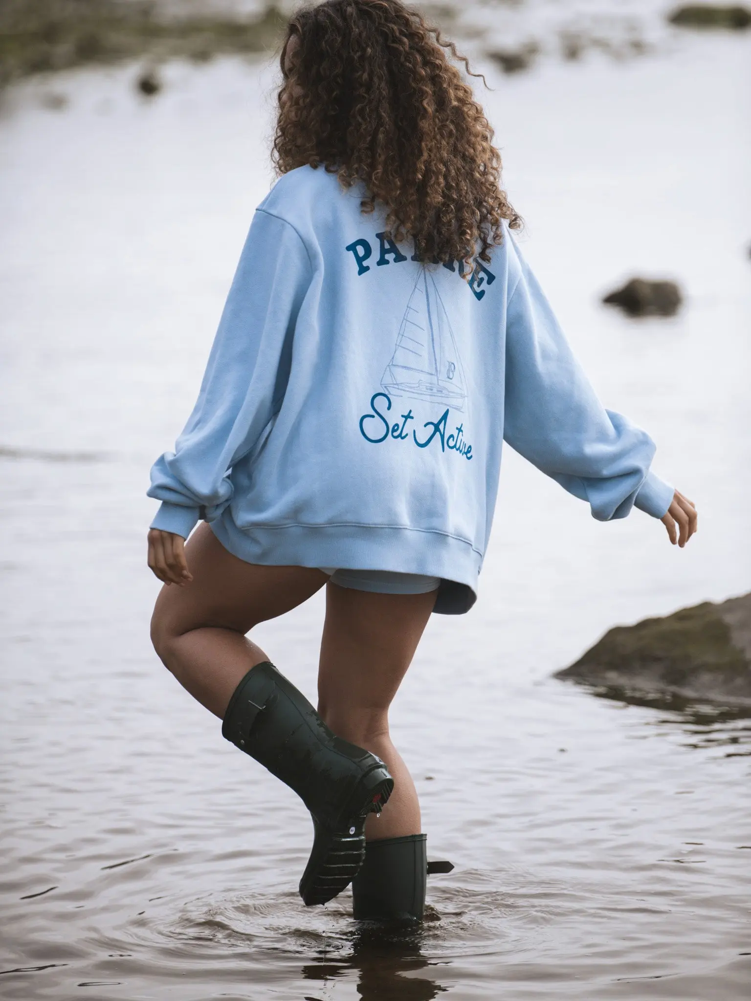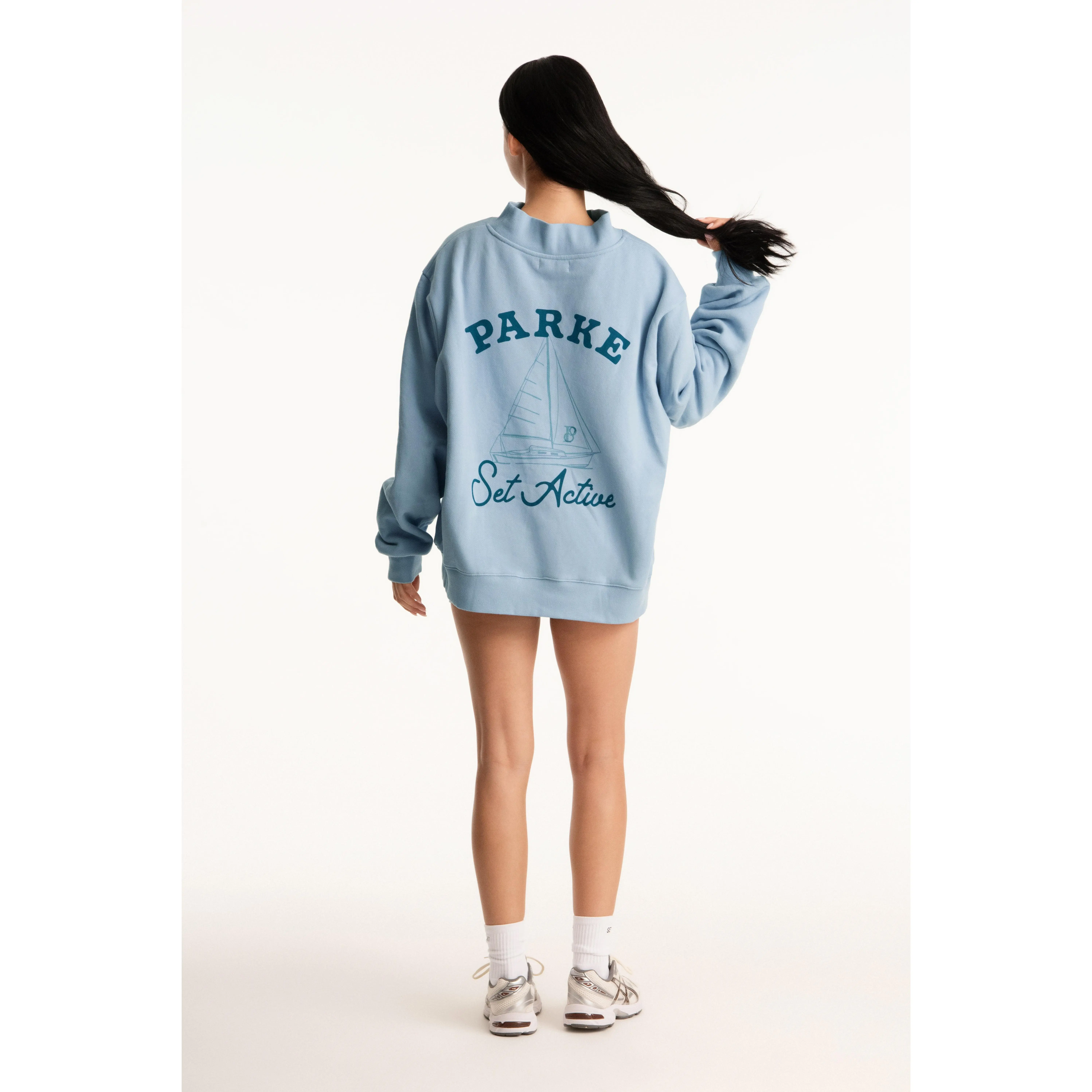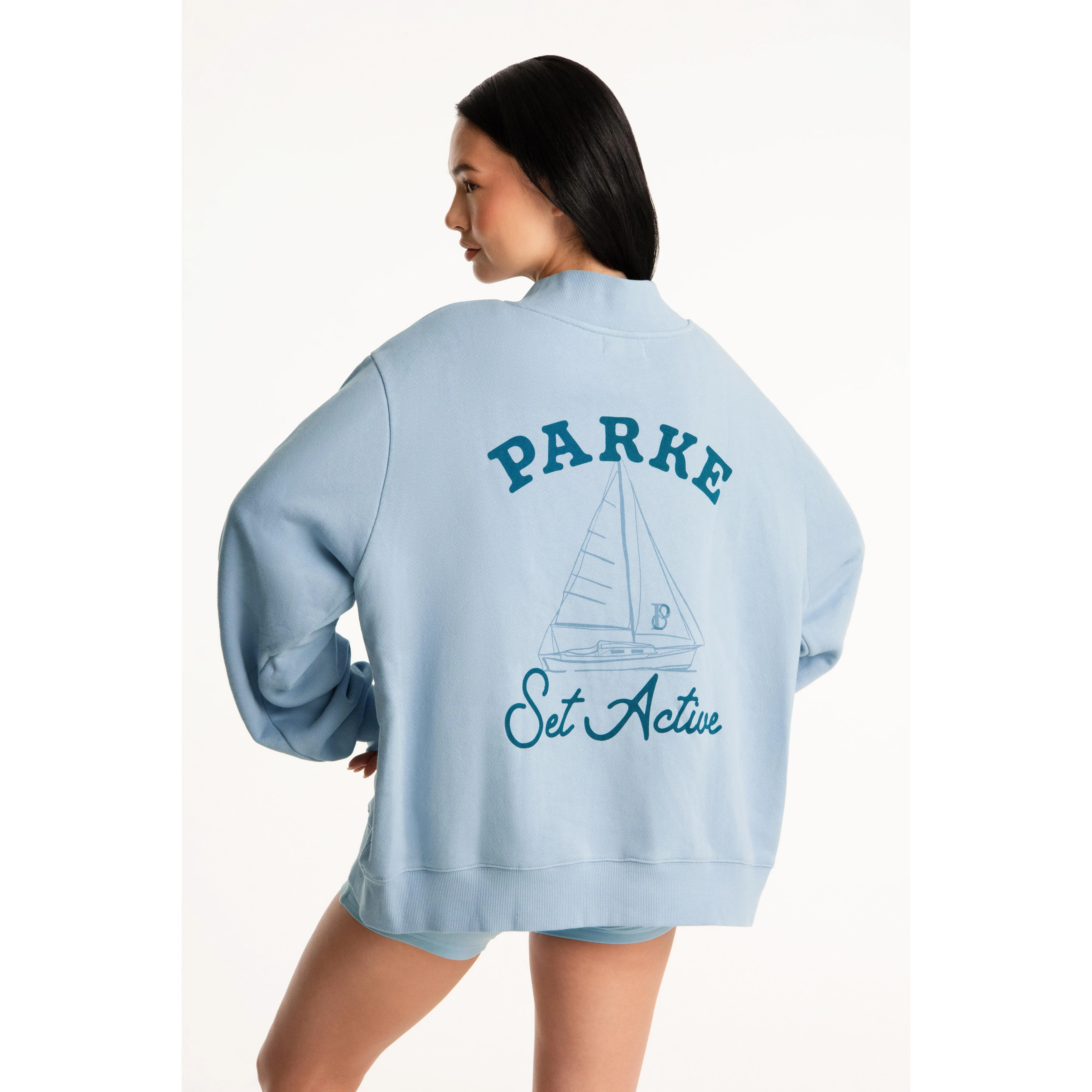 The SET x PARKE Sail Graphic Mockneck in Overcast pairs soft, breathable comfort with nautical style, featuring a screen-printed sailboat graphic and PARKE + SET lettering.