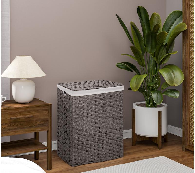 Laundry day feels more organized with this sturdy, handwoven lidded hamper. The removable, machine washable liner makes transporting clothes simple, while the sleek look blends seamlessly with any room. Two built-in handles and a lightweight design mean you can easily carry it wherever you need. From Seville Classics.