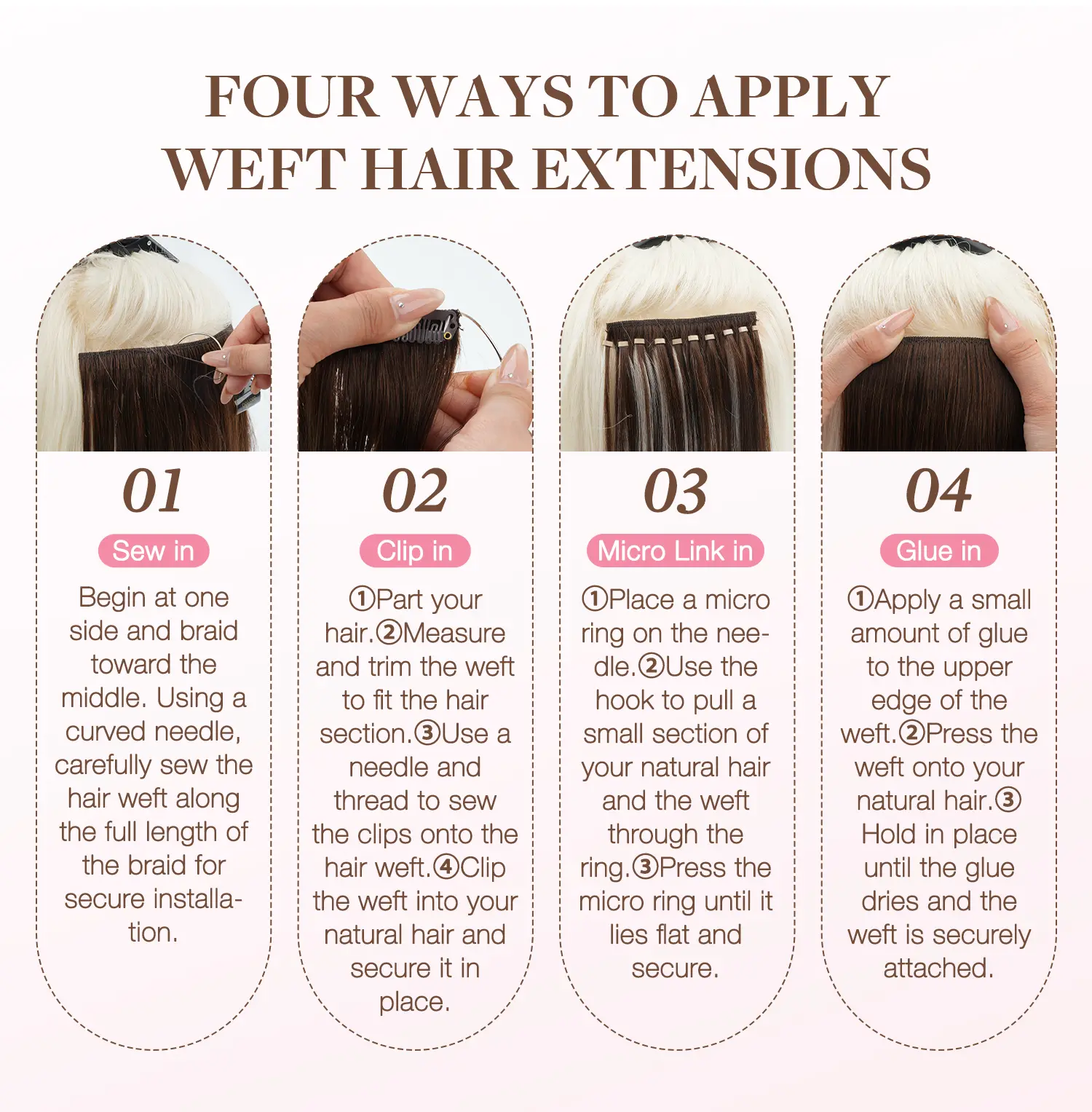 【Multiple Wearing Ways】GOO GOO weft hair extensions can be applied in different ways. Directly sew in, with clip-in, glue, tape, or micro beads. You can increase your hair volume according to your needs. The weft is light and soft that it fits perfectly to your scalp, seamlessly blending with your own hair.
