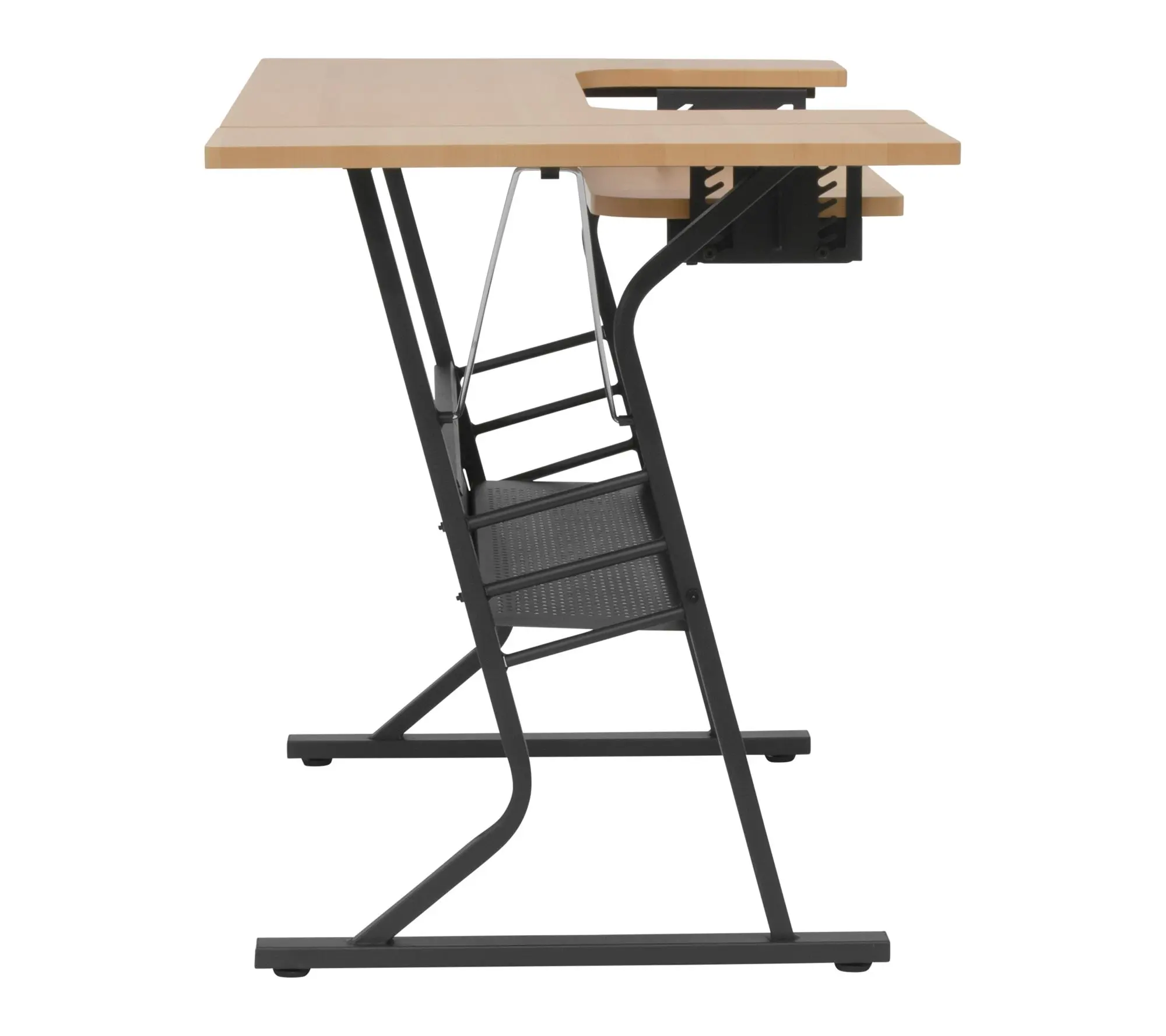 ·Features drop-down adjustable sewing machine platform; folding side shelf; lower storage shelf; powder-coated finish; four adjustable floor levelers for stability