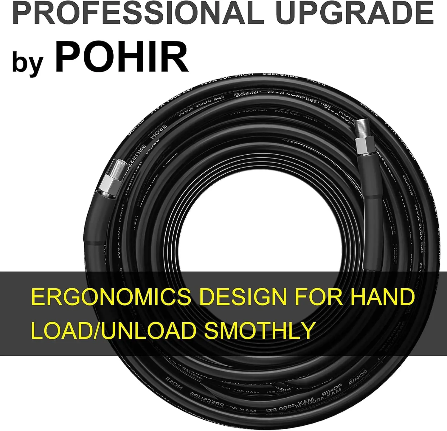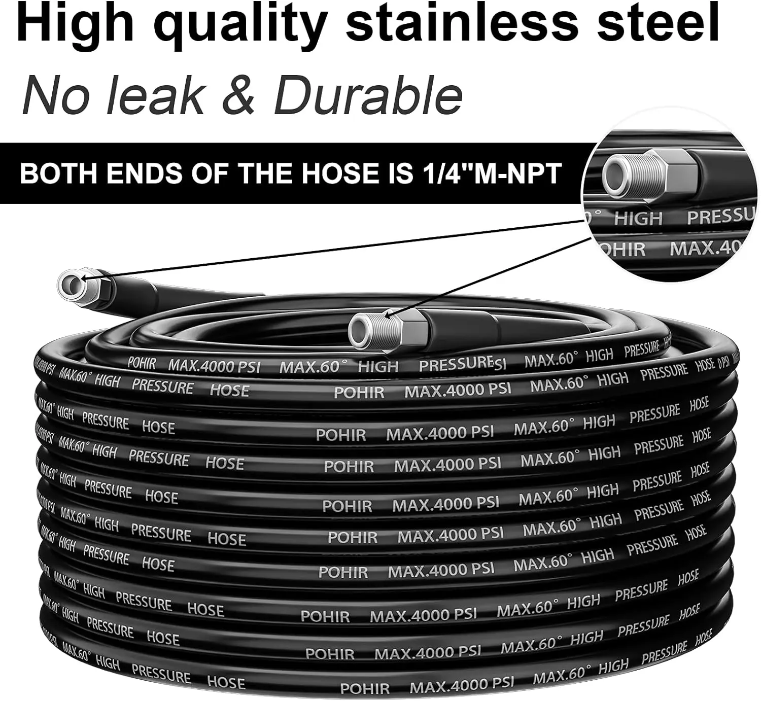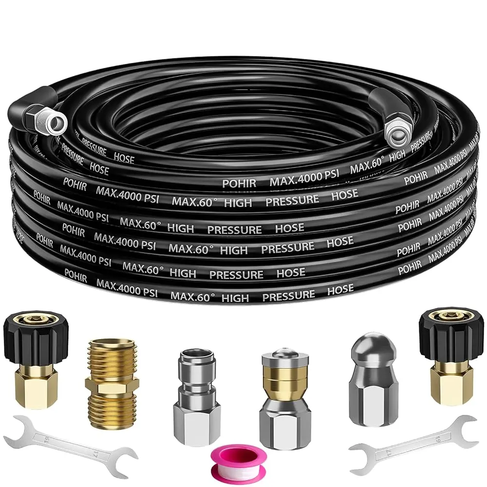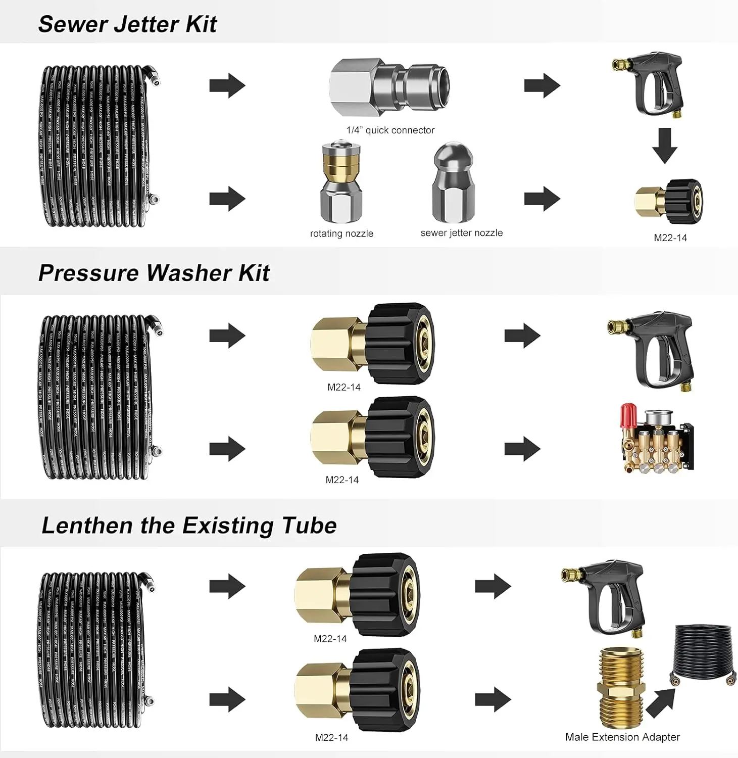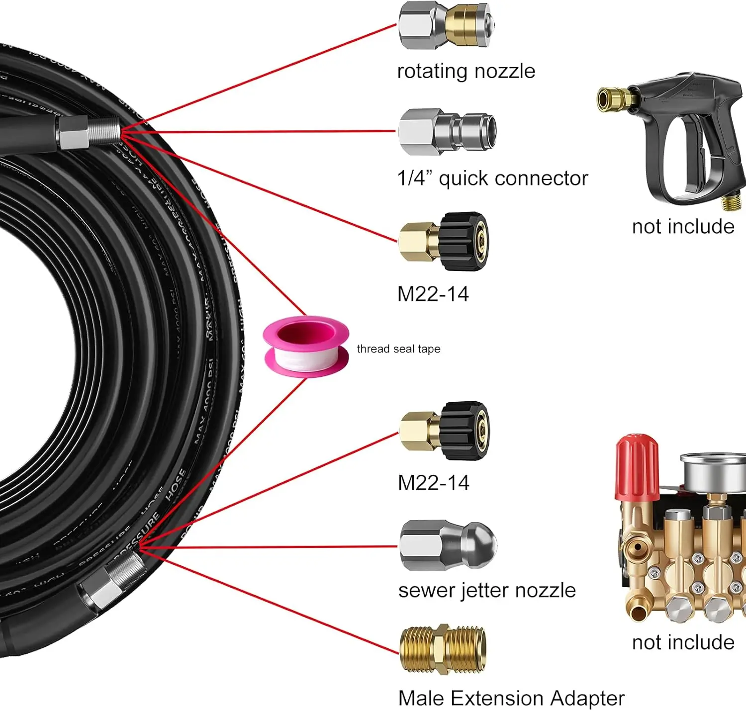 ·【HIGH QUALITY CLEANER HOSE】: Sewer jetter hose is composed of three layers: thermoplastic polyester inner pipe, textile braidpolyester reinforcement layer and thermoplastic polyurethane outer cover. This ensure that it can effectively deal with wear, ozone, exposure, oil Impact, thereby extending the life of the product. Suitable for many electric / gas-powered pressure washers up to 4,000 PSI.