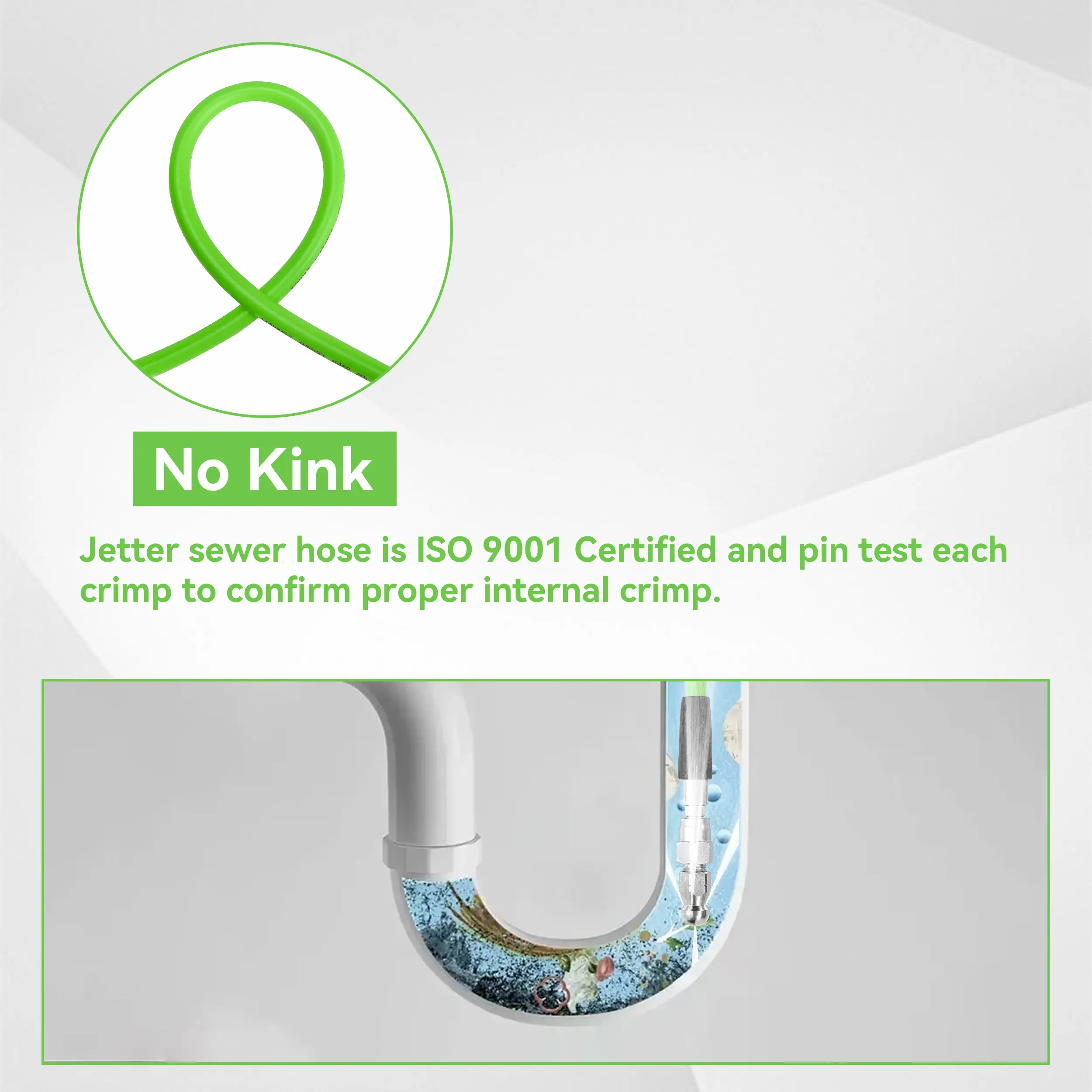 The upgraded hose features a 0.44-inch outer diameter with both fixed and swivel fittings to prevent kinks and ensure smooth movement through pipes. Constructed with a PE inner tube, PVC outer cover, reinforced terylene layer, and heavy-duty protective sleeves, it withstands harsh environments.