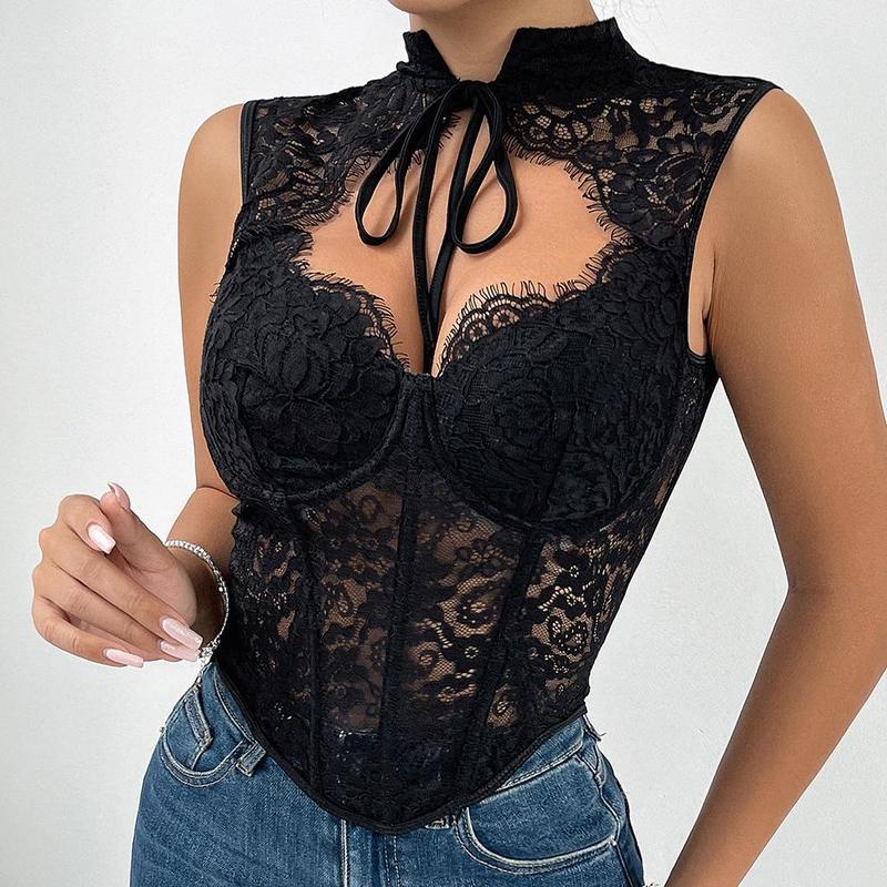 This tank top features a lace and boning design. Lace is ideal for women seeking a stylish look, and the boning adds a touch of sophistication and visual interest. The cutout design at the chest is surprisingly flattering.