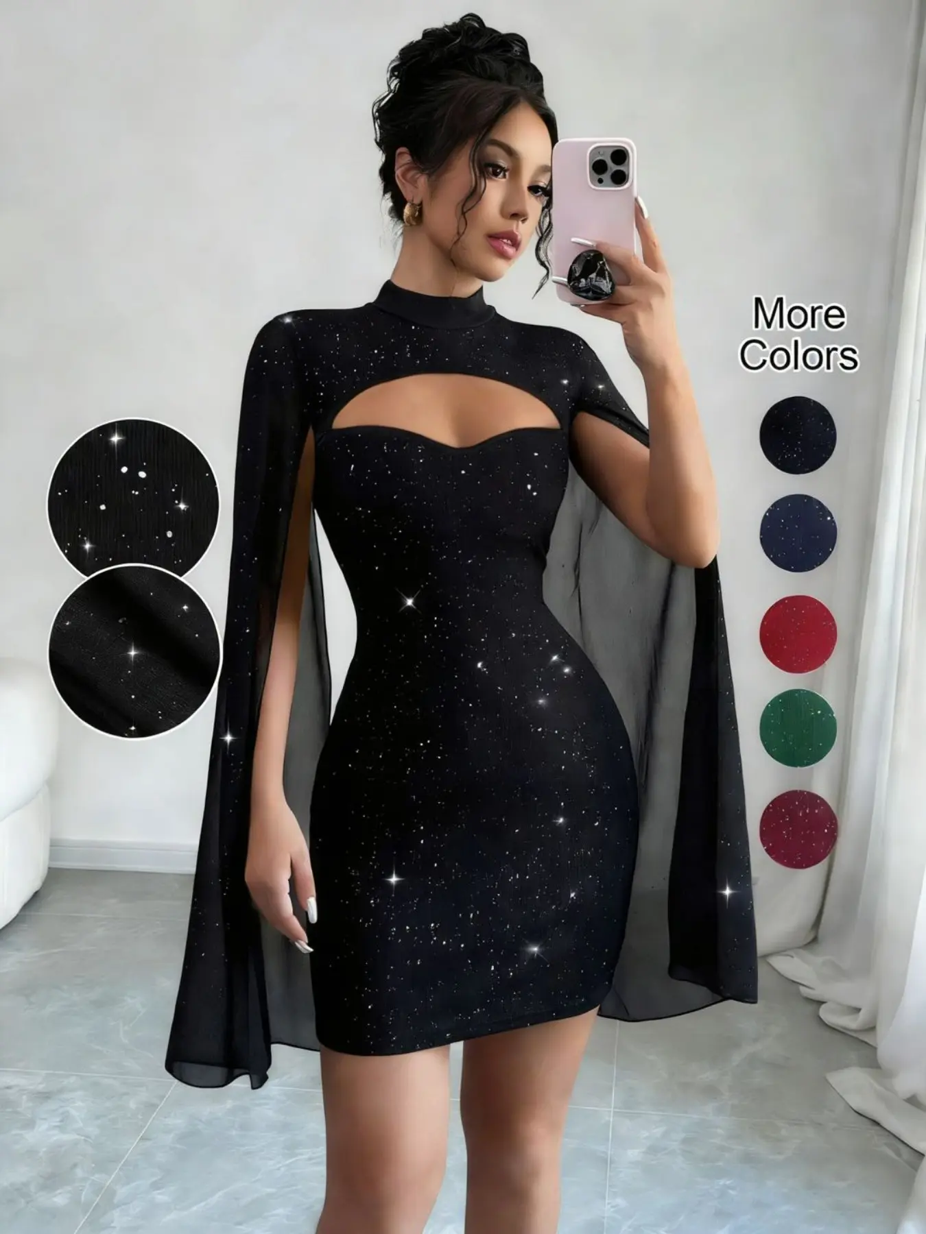 5. Spring & Fall Fashion Sexy Mini Bodycon Dress, Shawl Mesh Design, Cape Sleeves, Sparkling Sequins, Trendy Party Gown