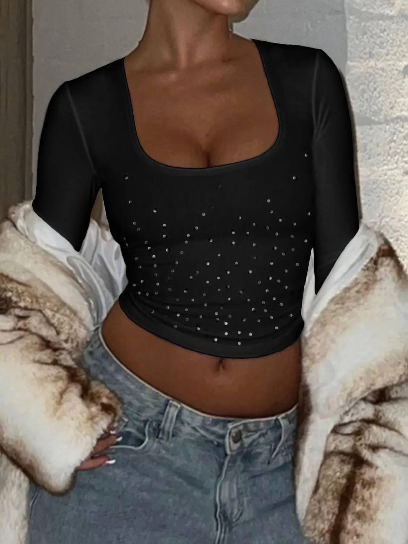 5. Sexy Square Neck Rhinestone Short Crop Fitted Long Sleeve T-Shirt, Casual Style, Spring & Fall Fashion, Women's Clothing Top
