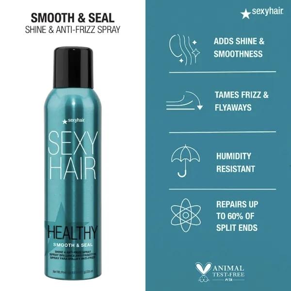 Get locked & loaded for smooth, anti-frizz goodness with Smooth & Seal Shine & Anti-Frizz Spray. It gives you up to 72 hours of humidity resistance & a high-shine finish; it smooths the cuticle and helps reduce the appearance of split ends after just one use until your next wash! This shine & anti-frizz spray doesn't weigh hair down and is excellent for dry cutting & professional use. Size: 6 oz Key Benefits:·Shine & Anti-Frizz Spray·Helps Reduce Appearance of Split Ends With Just One Use Until Next Wash·Provides Humidity Resistance & High Shine Finish for up to 72 Hours·Helps Mend Frayed Ends to Reduce the Appearance of Split Ends·Smooths the Cuticle·Provides Smoothness for up to 72 hours·Does Not Weigh Down HairSuggested Use: Spray over unruly or styled hair to enhance shine, smooth strands, and reduce frizz. Pro Tip: Mist before snapping photos—it's the perfect lightweight shine boost that makes hair sparkle on camera. *After each use.