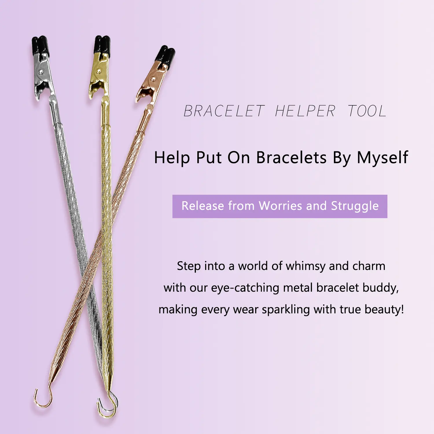 Effortless Operation: Simplify the process of putting on your bracelets with these handy tools. Just pinch the end of your bracelet, hold the tool in the same hand as your wrist, and use your other hand to close the clasp. It's a quick and easy solution, allowing you to independently wear your jewelry with ease.