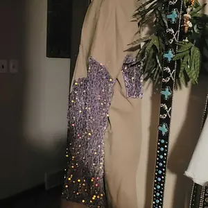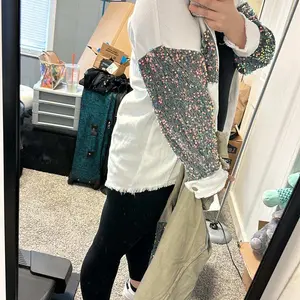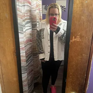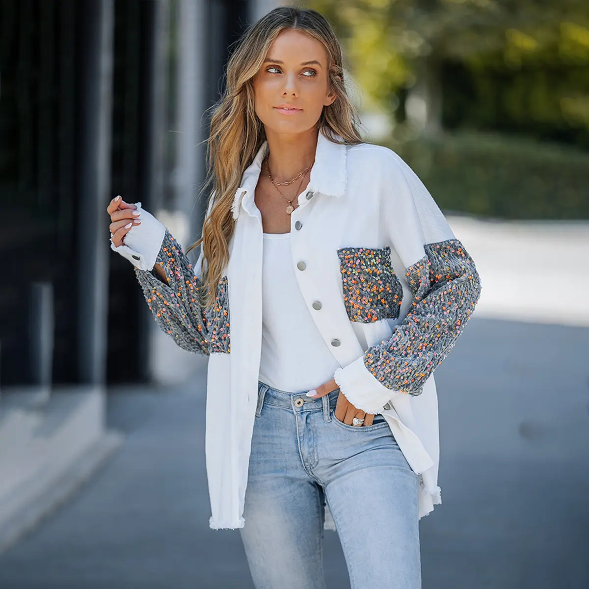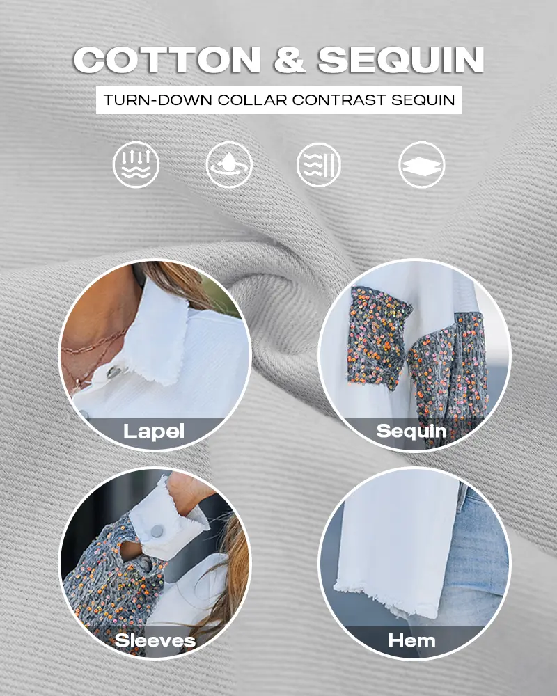 ·Feature Details: This casual jacket features oversized cut, raw trim, turn-down collar, button down closure, mesh and sequin spliced long sleeves, sequin pockets, high-Low hem.